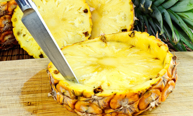 L'erreur de départ est de vouloir retirer l'écorce de l'ananas en une fois à l'aide d'un grand couteau. Il est pourtant beaucoup plus facile et rapide de découper l'ananas en tranches assez épaisses et de retirer, uniquement ensuite, l'écorce à l'aide d'un petit couteau d'office. Cette action permettra d'obtenir des tranches d'ananas uniformes et de contrôler chaque étape de la découpe. Une fois l'écorce retirée, il ne restera plus qu'à découper le cœur à l'aide du même couteau ou d'un emporte pièce.