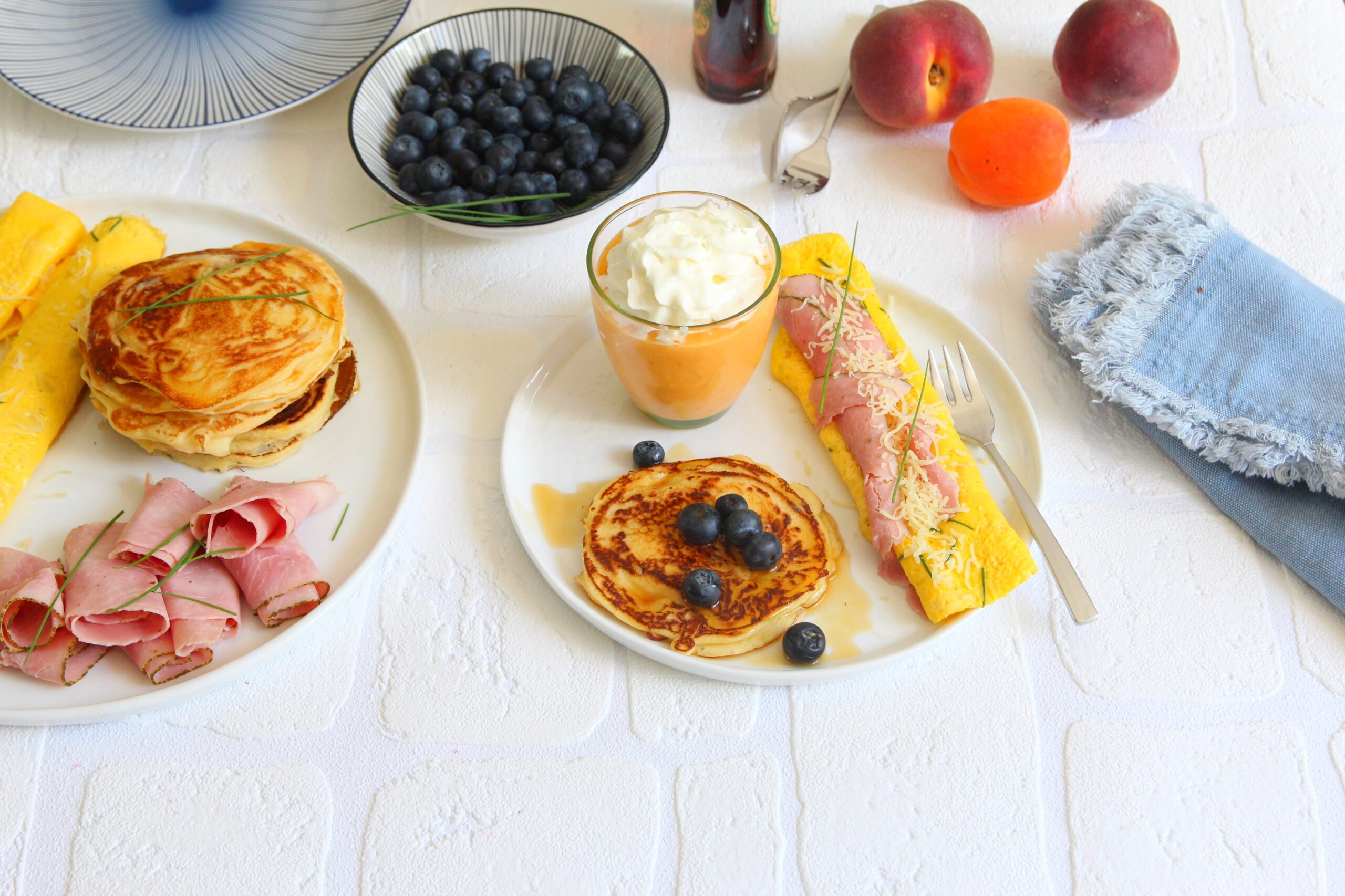 Brunch : Oeuf au jambon, Pancakes myrtilles, Smoothie