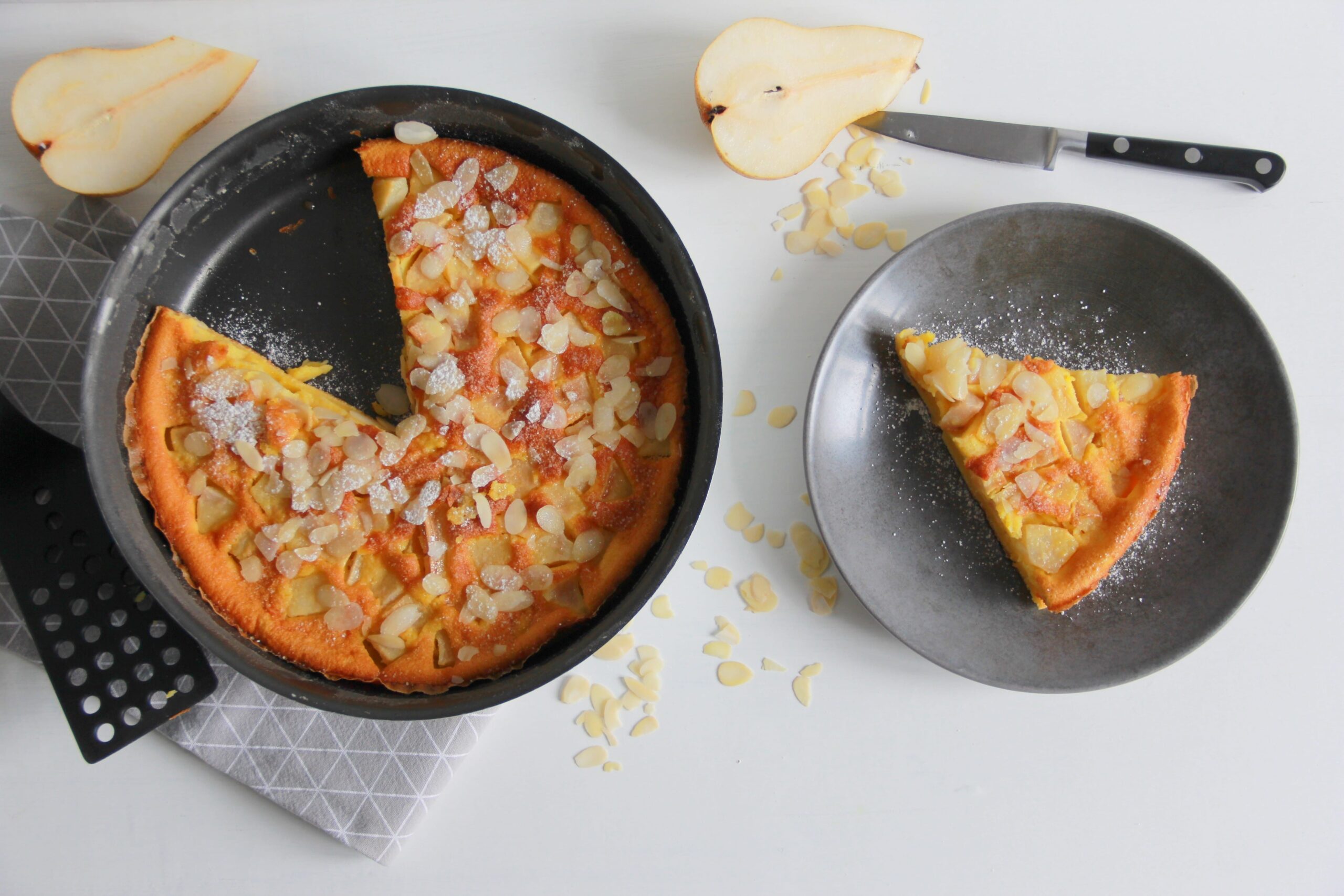 - Ensuite, je verse la préparation à base d’œufs, de fécule et de crème dans la poêle. Dès que le fond commence à colorer, je retourne le clafoutis et je fais cuire l’autre côté.