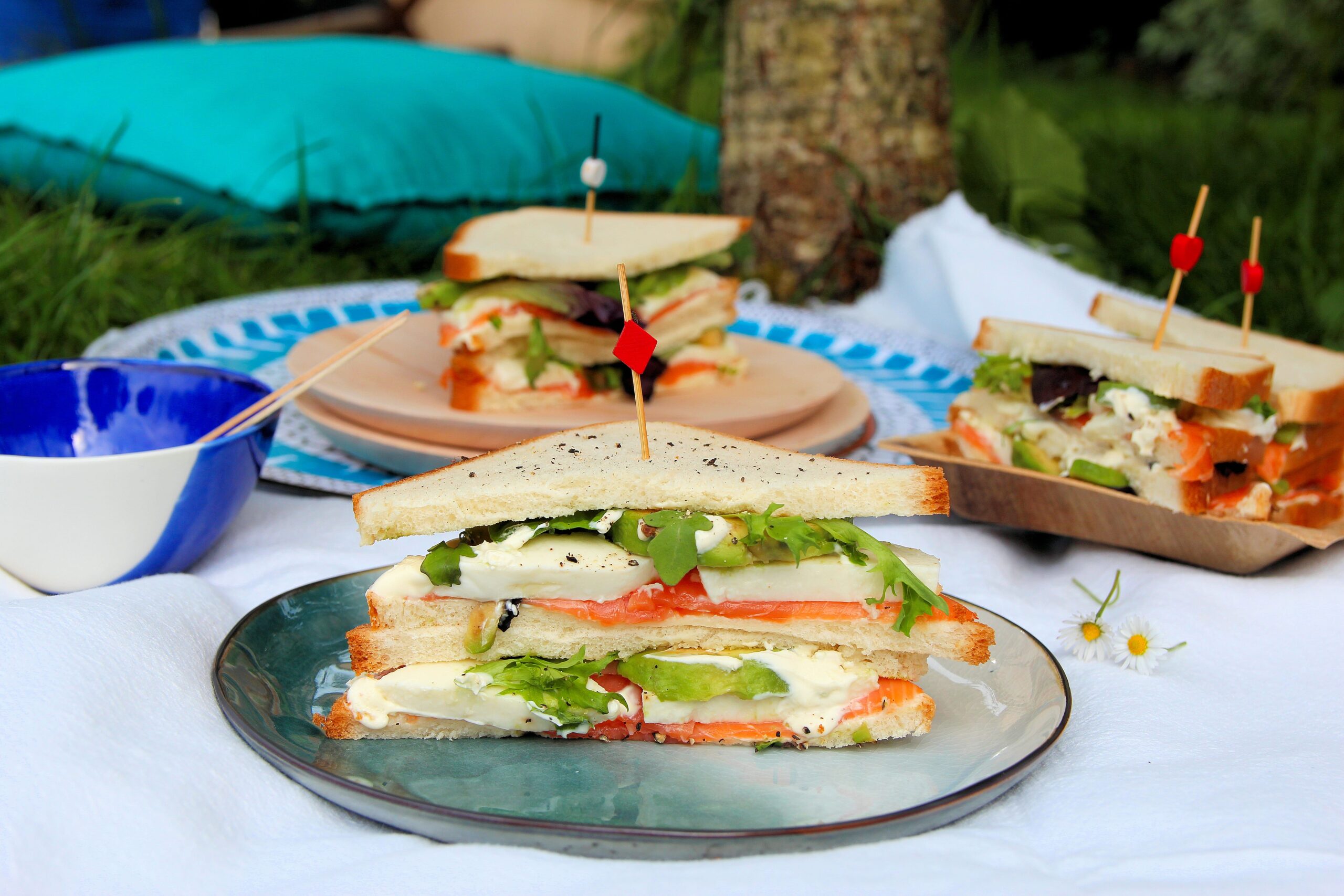 Club sandwich saumon fumé, avocat, mozzarella, crème, mesclun