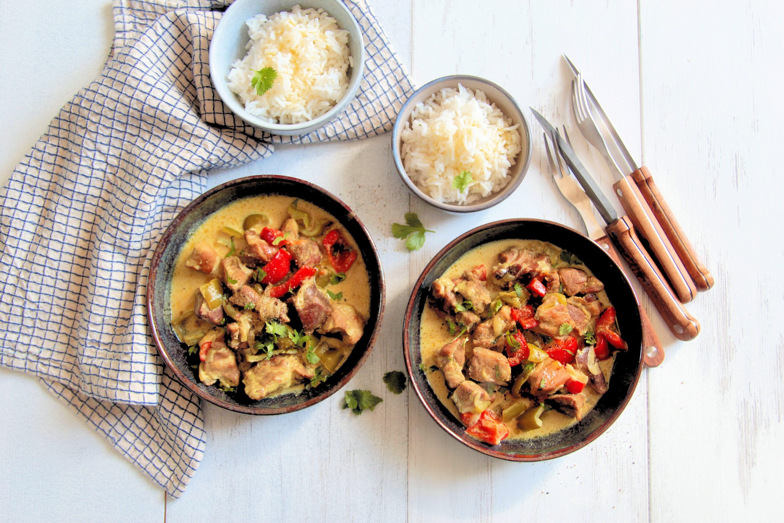 1. Je commence par découper le sauté de porc en gros cubes, que je mélange ensuite avec 1 cuillère à soupe d’épices colombo.