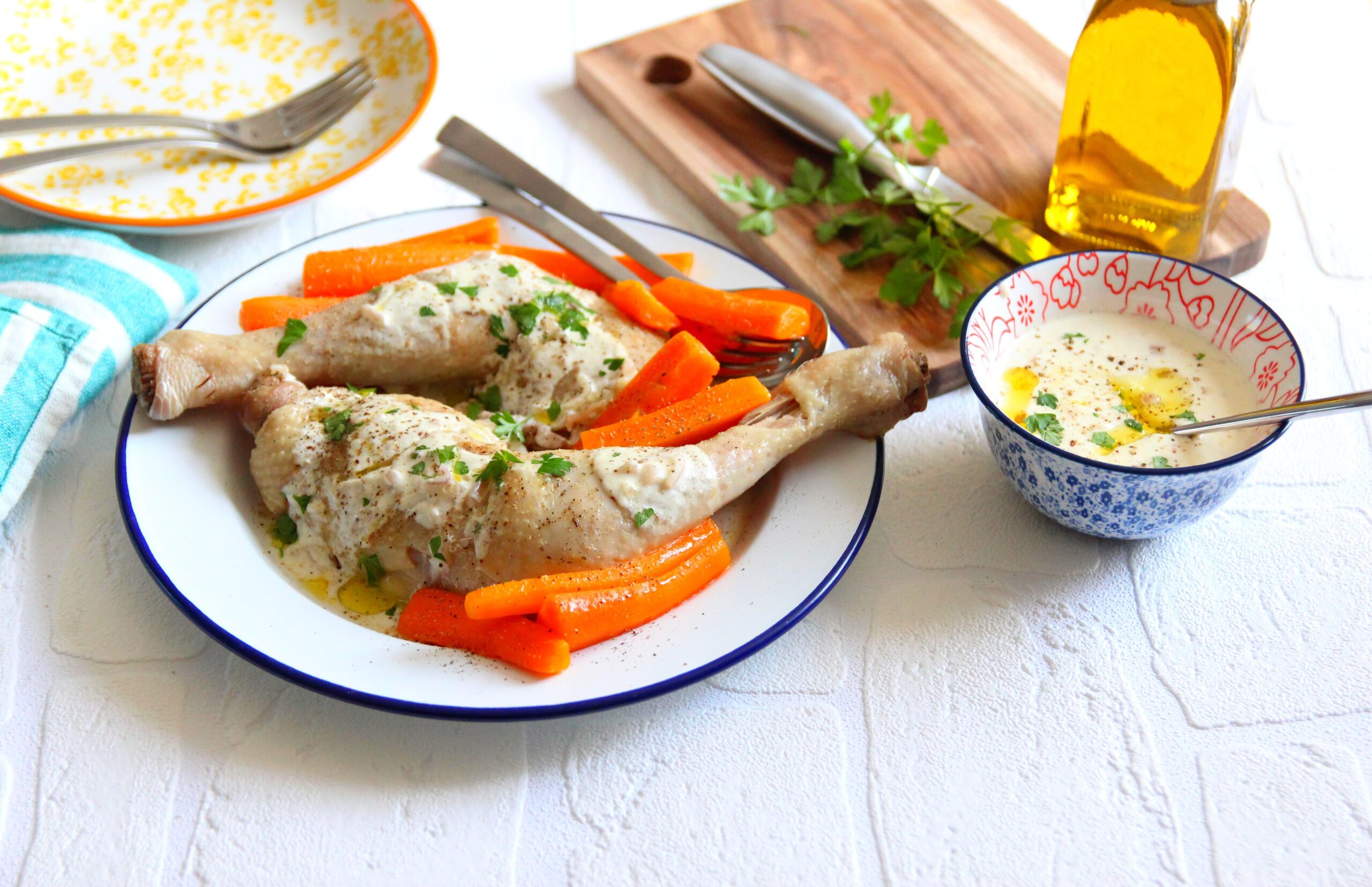 - Je nappe les cuisses de poulet de sauce à l’échalote et les accompagne des carottes glacées. Enfin, je parsème le tout de persil fraîchement haché.