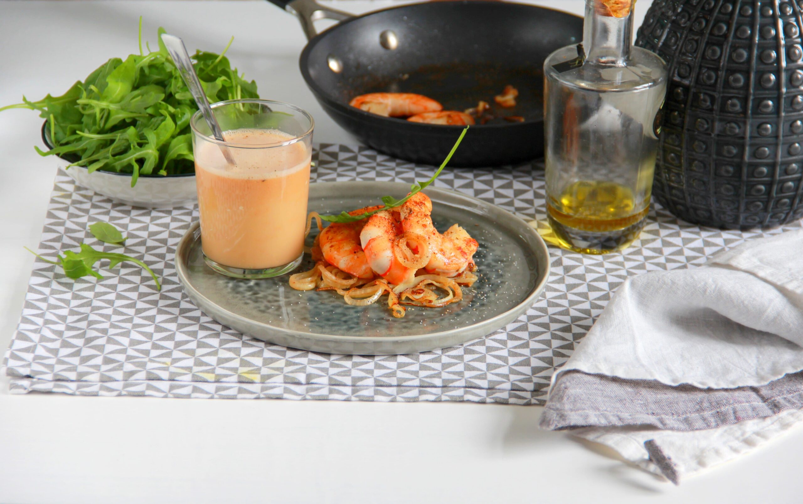 Je sers aussitôt les langoustines flambées avec la bisque aux langoustines. Bon appétit !