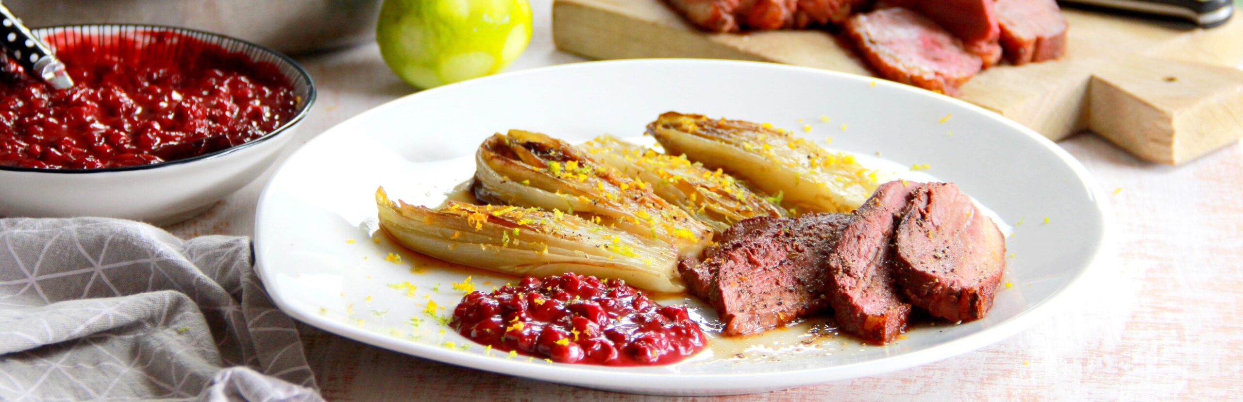 - Magret de canard rôti aux épices, pommes de terre à la suédoise et sauce aux cranberries