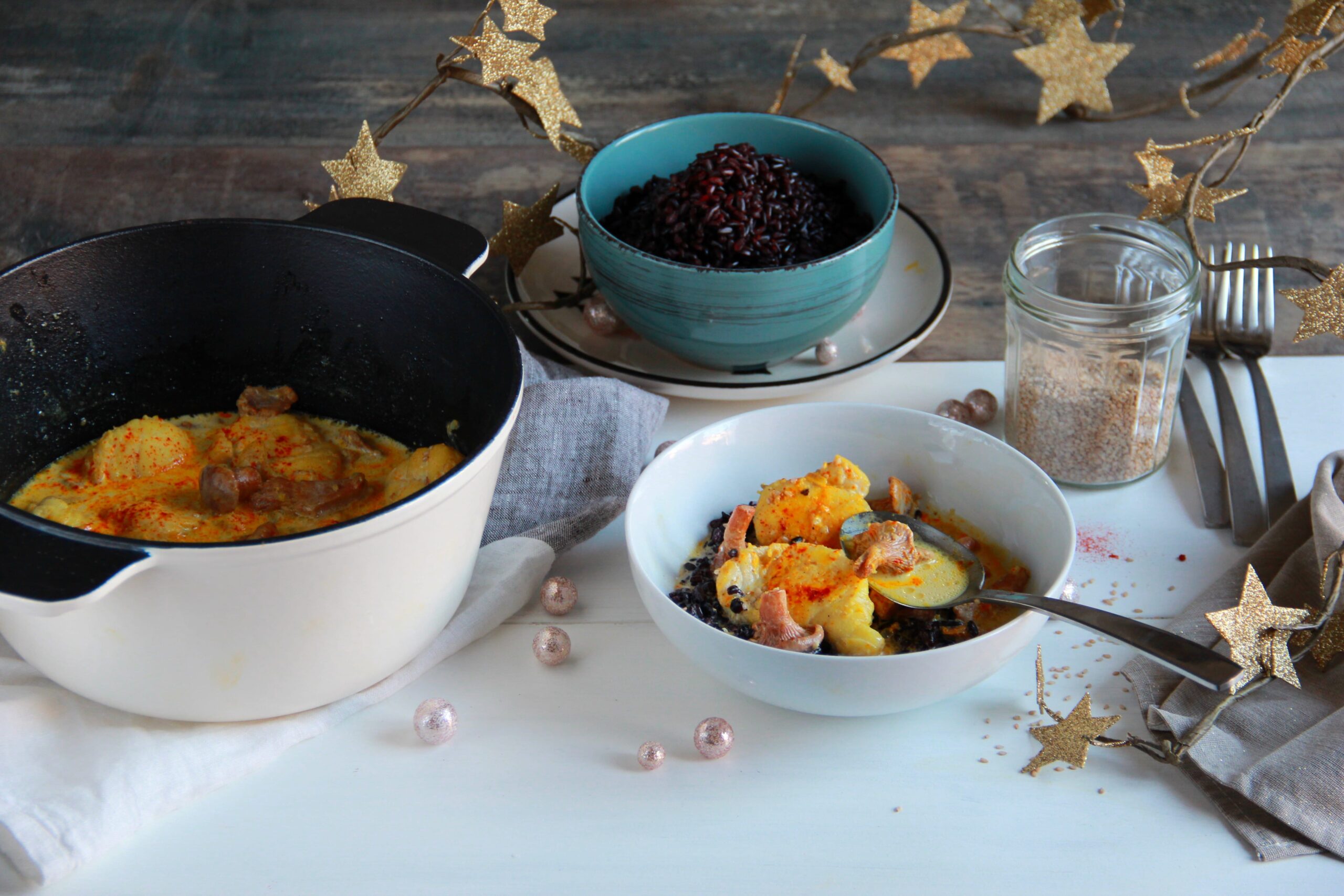 - Je verse ensuite la crème, le cognac et le safran, je sale, je poivre et je remue bien le tout.