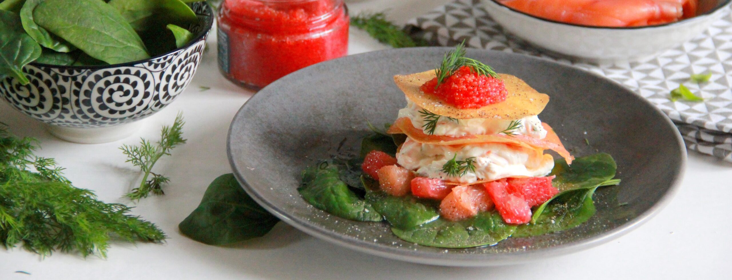 5. Je mélange le fromage frais et la crème épaisse Bridélice, j’ajoute le wasabi, l’aneth ciselée, le poivre et le sel. Je vérifie l’assaisonnement. Je coupe en petits cubes le pamplemousse restant et je l’ajoute au mélange de fromage frais et de petit suisse.