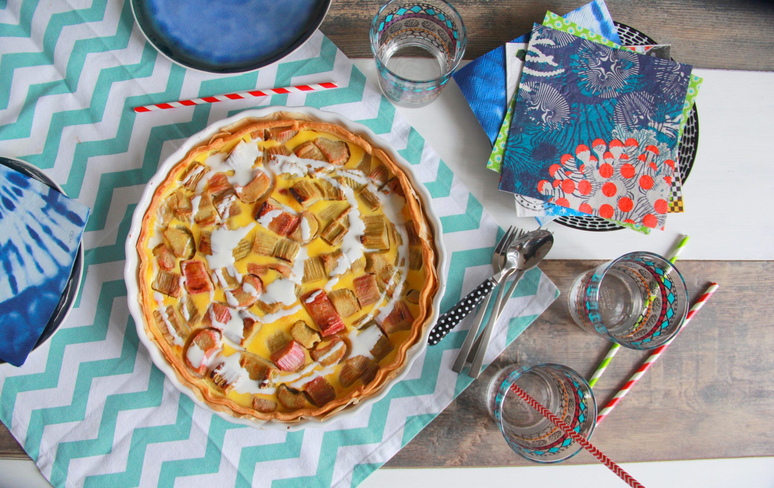 - Dans un mixeur, je mélange le sucre restant avec les œufs entiers et la crème jusqu’à obtenir un mélange homogène. Je verse ensuite cette préparation sur la rhubarbe étalée dans le moule à tarte.