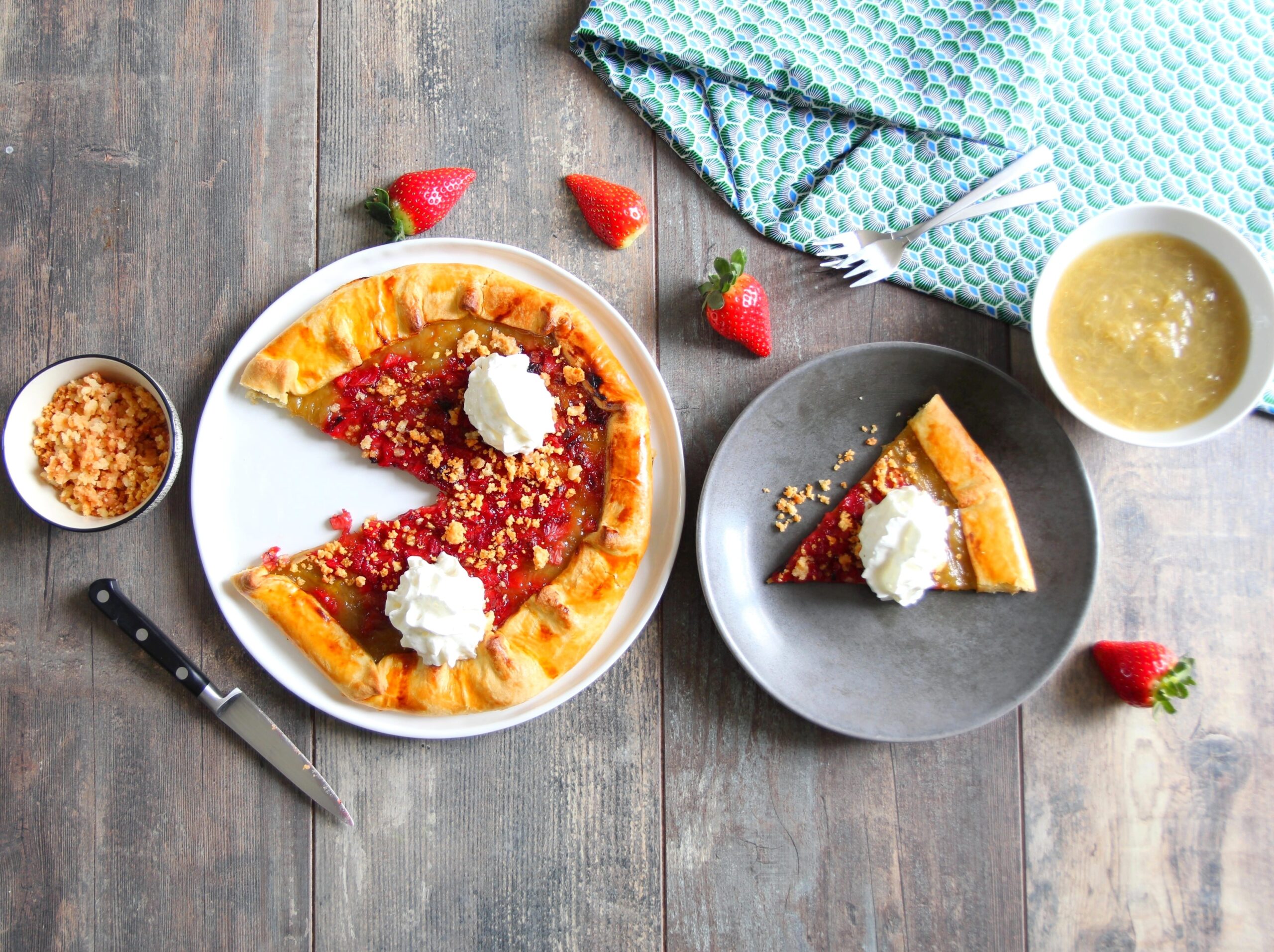 - Pour réaliser la tarte fraise-rhubarbe façon crumble, je verse d’abord le mélange rhubarbe-miel sur le fond de la tarte, puis le mélange fraises-miel.