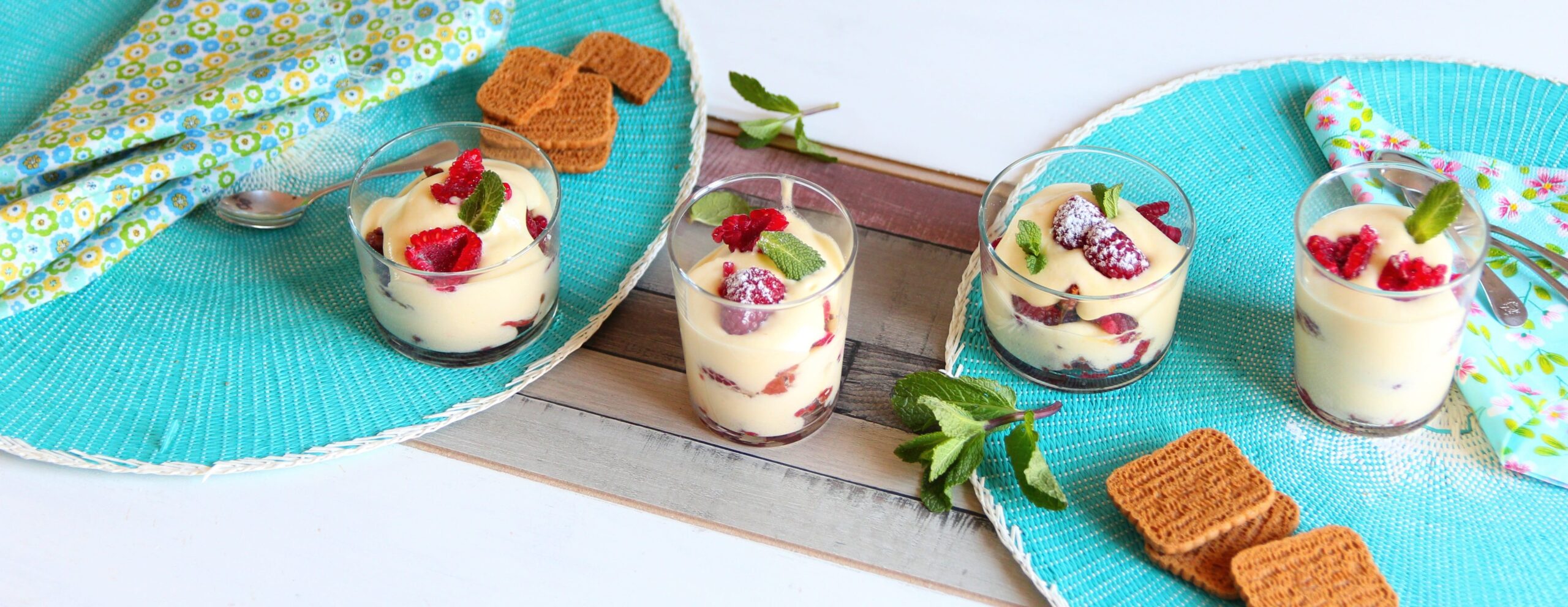 - Je recouvre les morceaux de spéculoos de deux cuillerées de crème et j’ajoute quelques framboises.