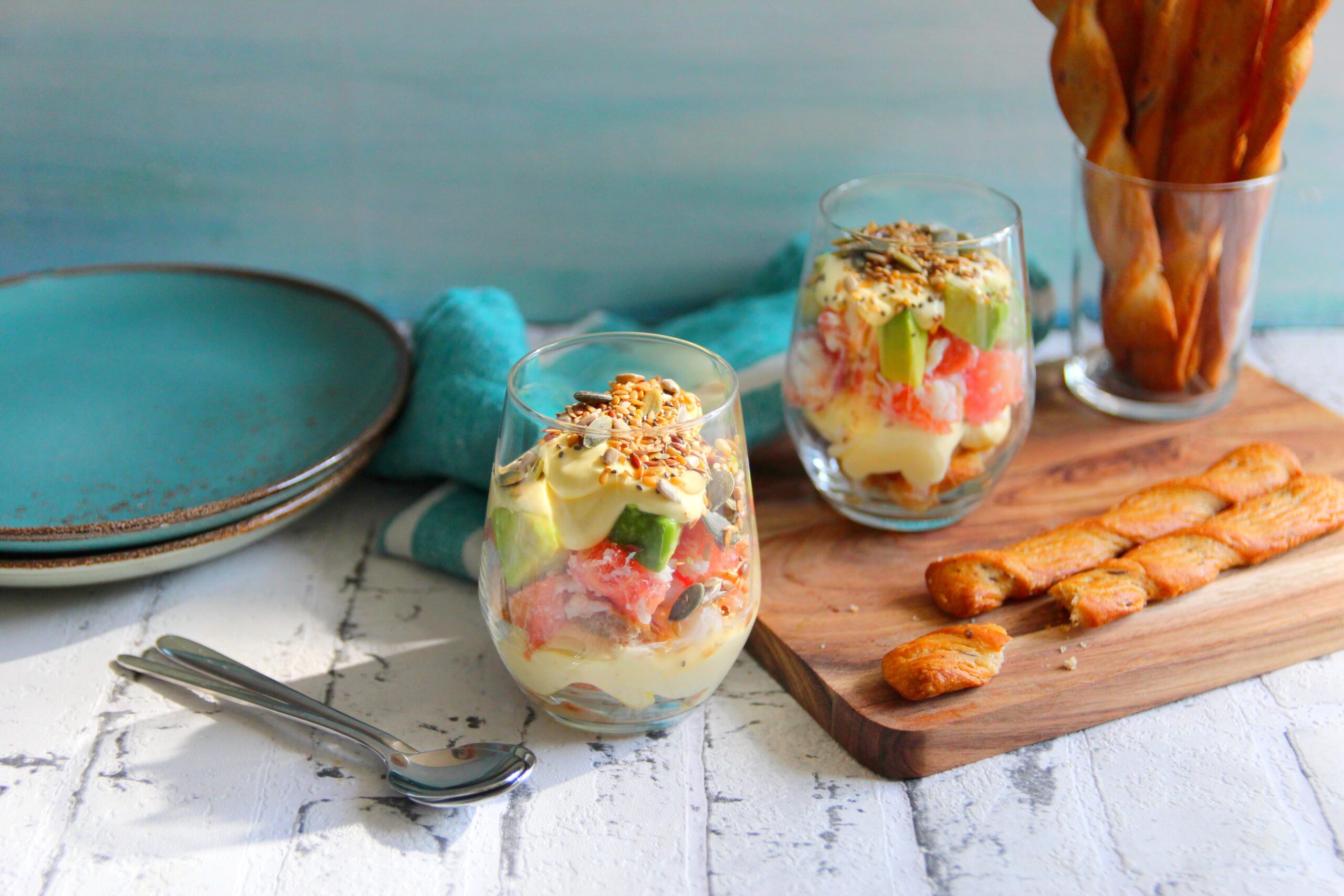 - Je verse la moitié du mélange crémeux, puis je dépose le tartare pamplemousse/avocat.