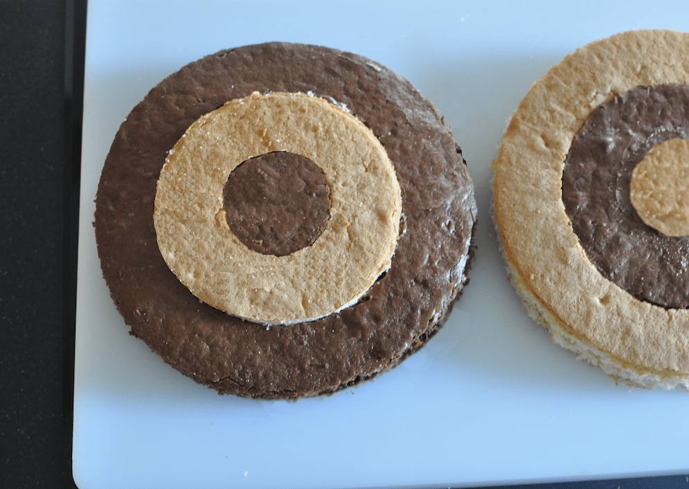 Il suffit de réaliser 2 gâteaux de la même taille, en 2 parfums et couleurs différents. Ensuite, couper 3 cercles dans chaque gâteau. Reconstituer ensuite chaque gâteau en alternant un rond de gâteau blanc avec un rond de gâteau au chocolat et d'inverser sur le 2ème étage.Ensuite, on superpose les 2 gâteaux reconstitués. On étale le glaçage sur l'ensemble avec une spatule large et on place au réfrigérateur pendant 1 heure.