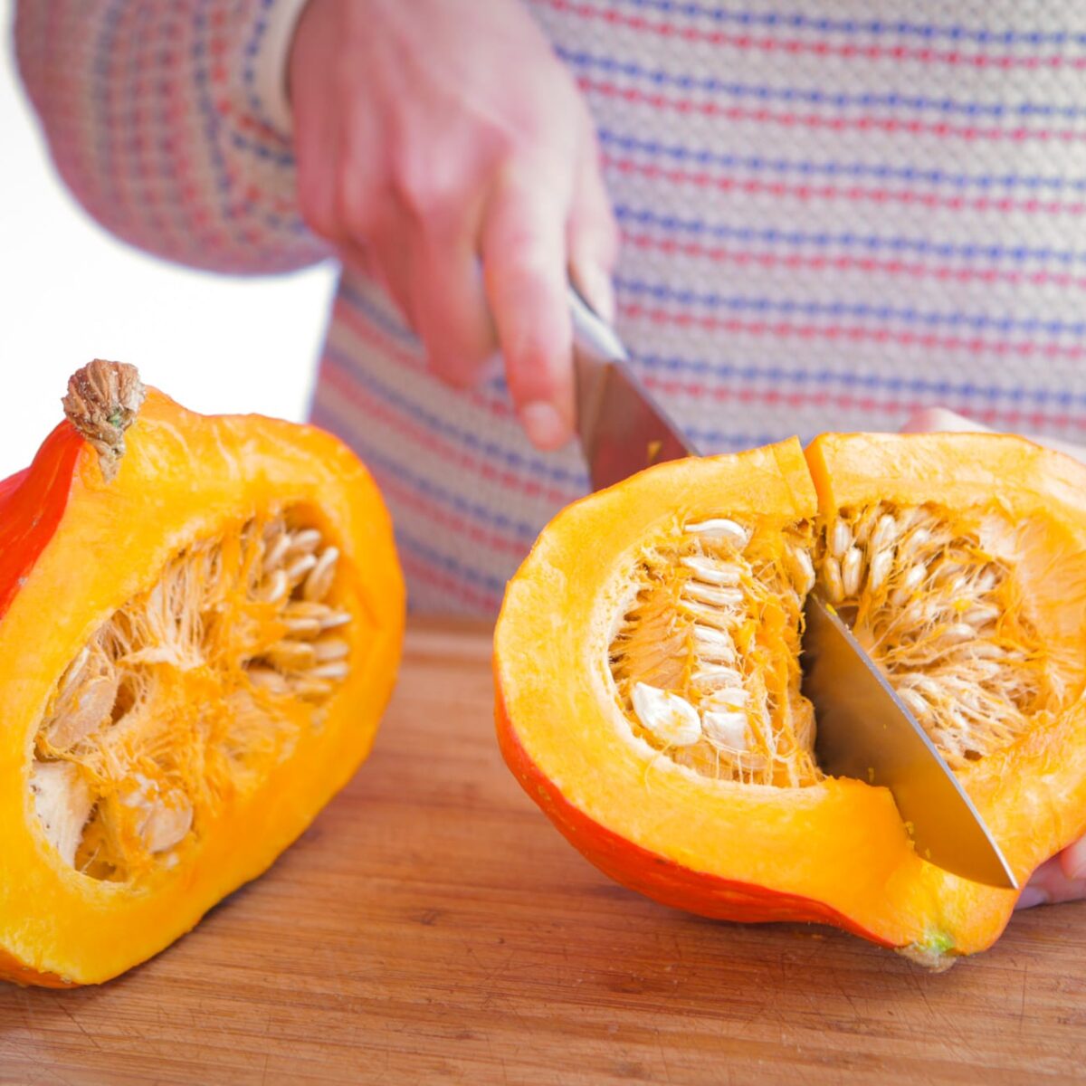 Couper le potimarron relève souvent de l'épreuve du combattant, le mieux étant déjà de s'armer de patience. Pour vous faciliter la tâche, utilisez un couteau bien affuté et solide. Si la lame est trop souple, elle risque de casser à l'intérieur ! Les couteaux de céramique sont tout à fait adaptés. Rien ne sert de forcer, faîtes levier ou faîtes comme une scie, plutôt que d'essayer de couper d'un seul coup. Et une fois que vous avez divisé votre courge en deux, vous réussirez plus facilement à détailler des morceaux si vous coupez du côté chair et non pas du côté peau.
