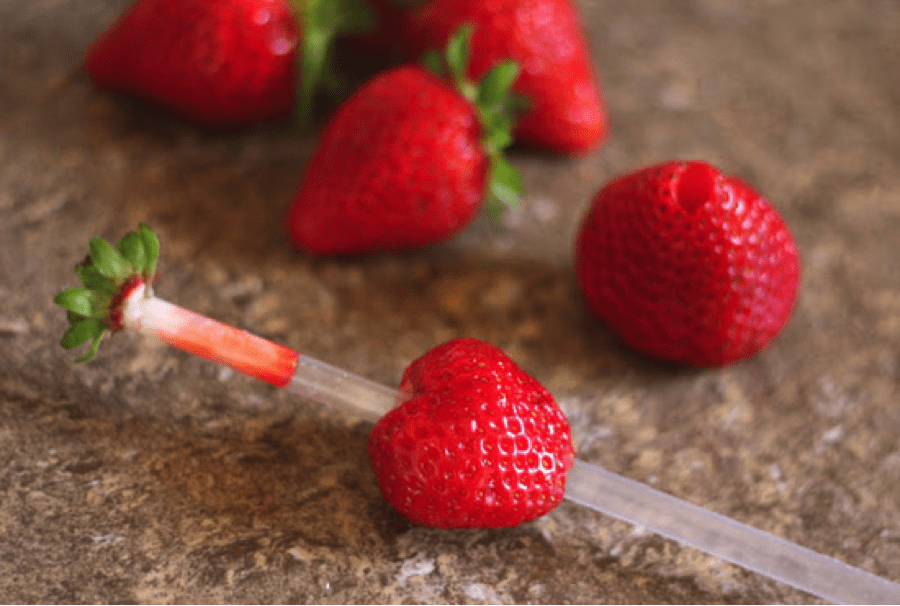 Pour équeuter des fraises facilement, il vous suffit d'utiliser une paille bien rigide et de pousser de la pointe de la fraise vers la queue. Quelques secondes suffisent et vous pouvez ensuite glisser un peu de crème Bridélice sucrée à l'intérieur… Un délice.
