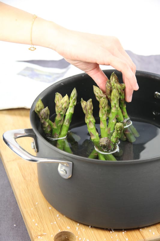 Il est inutile d'éplucher les asperges vertes mais les blanches doivent bien être pelées pour enlever leur peau extérieure. Si vous cuisez les asperges dans de l'eau, réalisez un fagot avec des aspreges de même grosseur et faite les cuire debout dans la casserole avec les têtes hors de l'eau. La cuisson sera ainsi homogène et parfaite du pied à la pointe. Pour preserver la couleur de vos légumes, ajoutez une goutte de citron dans l'eau de vos asperges blanches et plongez les asperges vertes dans de l'eau glacée à la fin de la cuisson.