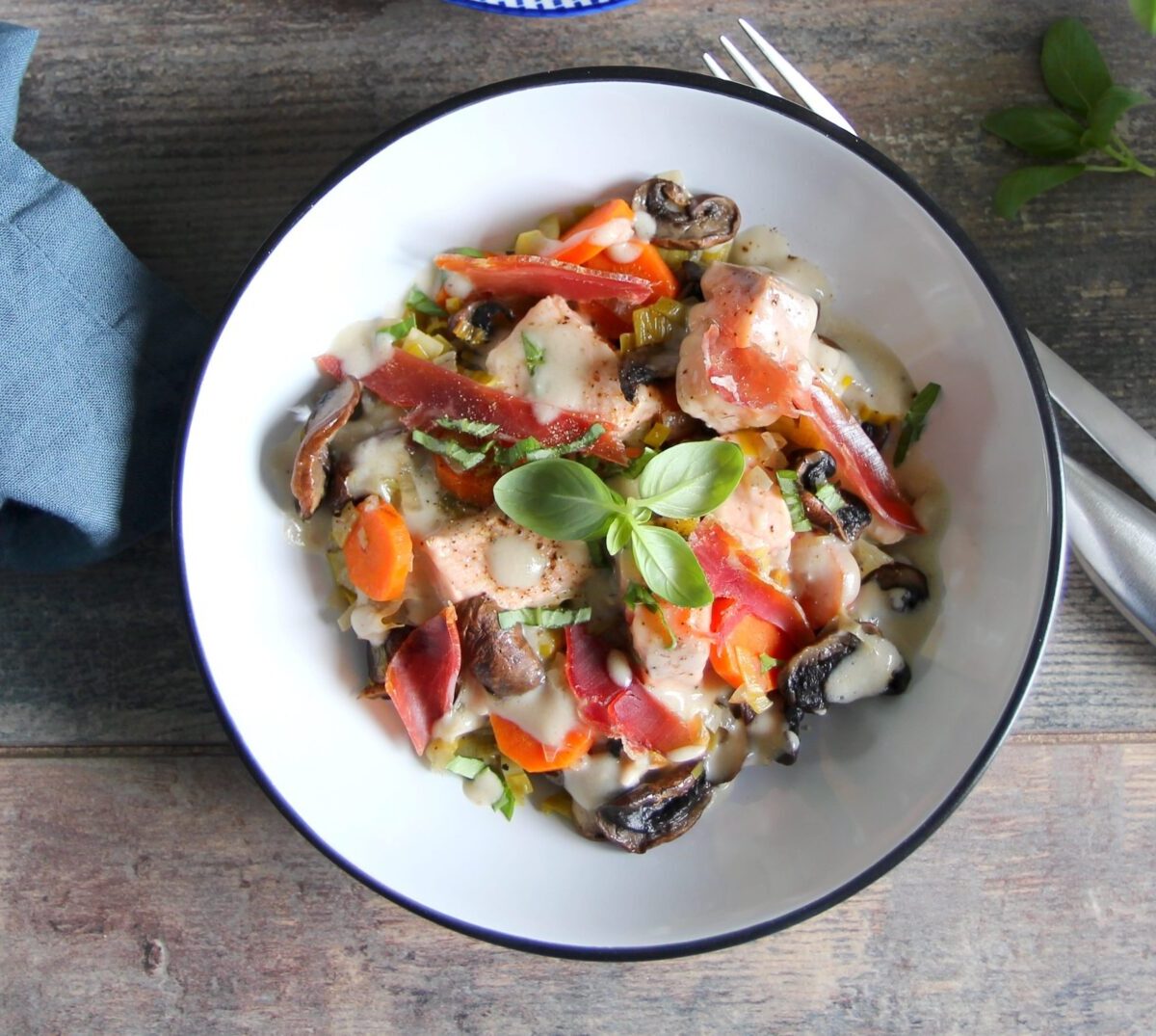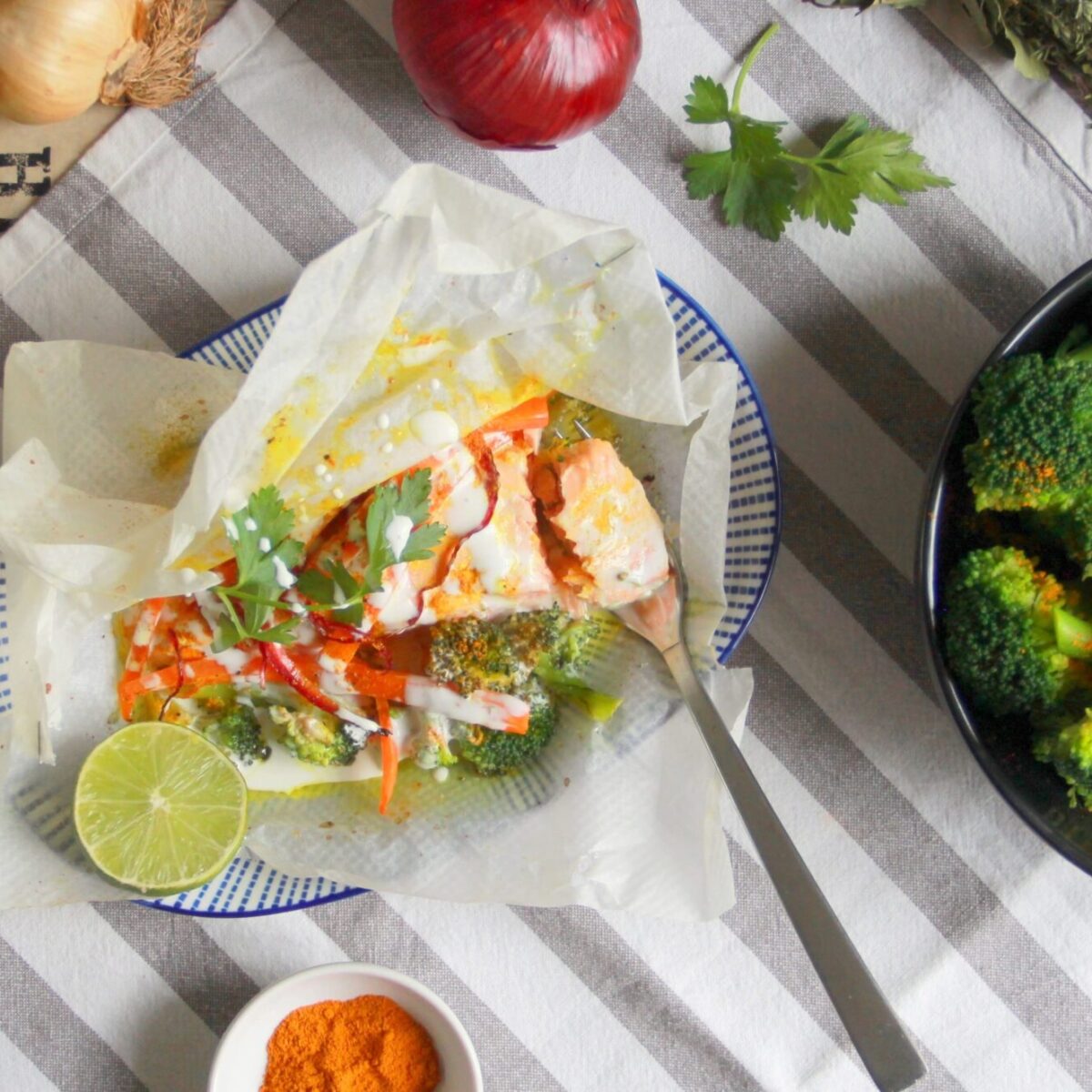 Dos de saumon, sauce curcuma et ses chips légères de chou kale