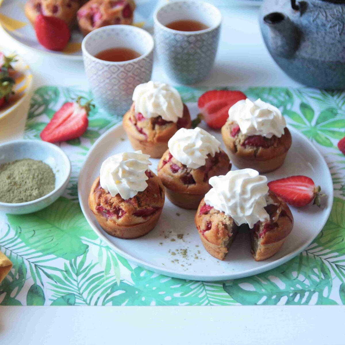 Muffins aux fraises, thé Matcha et crème fouettée