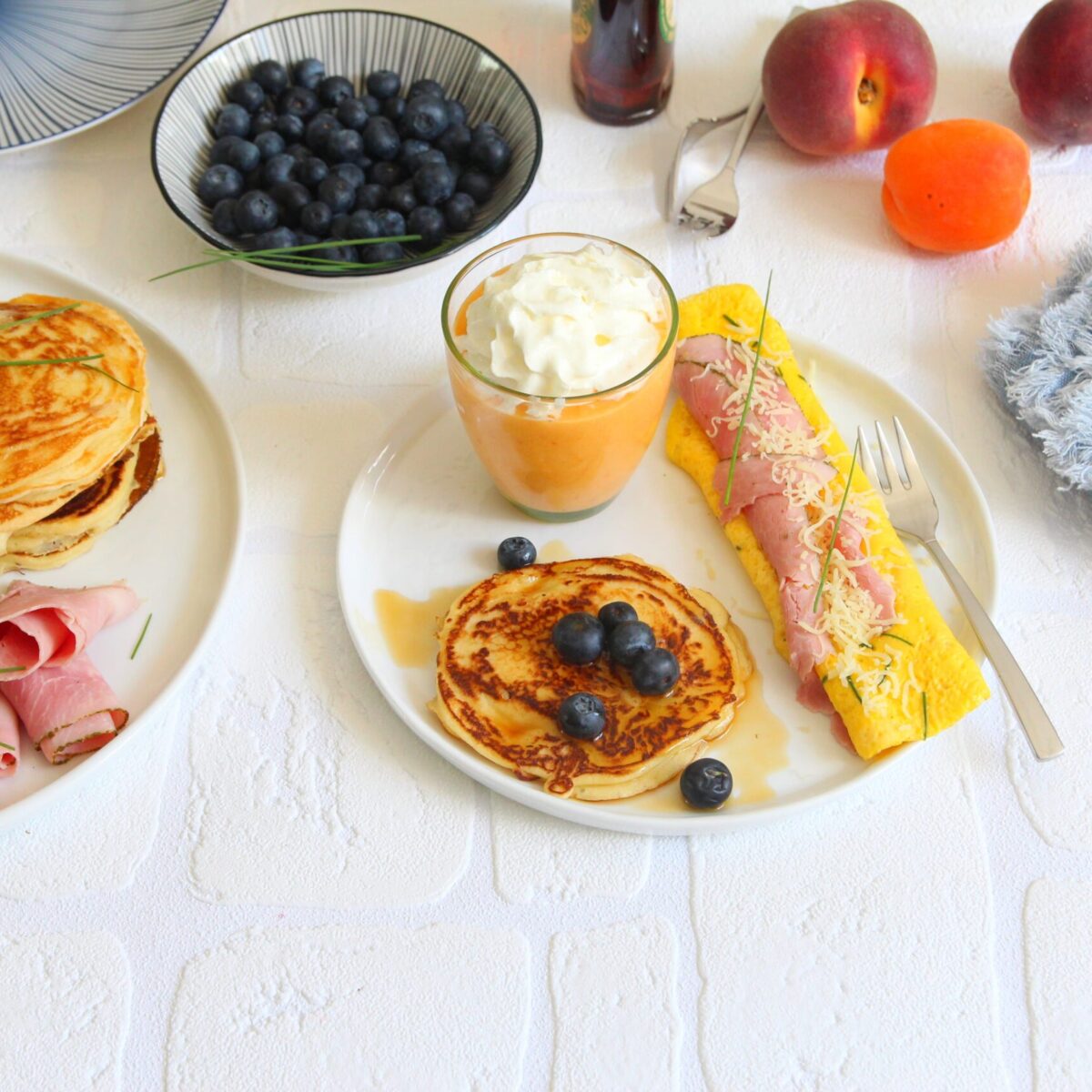 Brunch : Oeuf au jambon, Pancakes myrtilles, Smoothie
