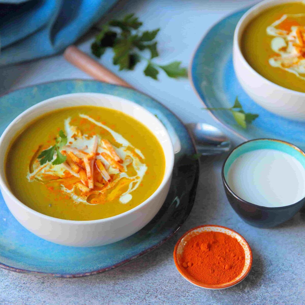 Soupe pimentée au lait de coco, crème et légumes de saison