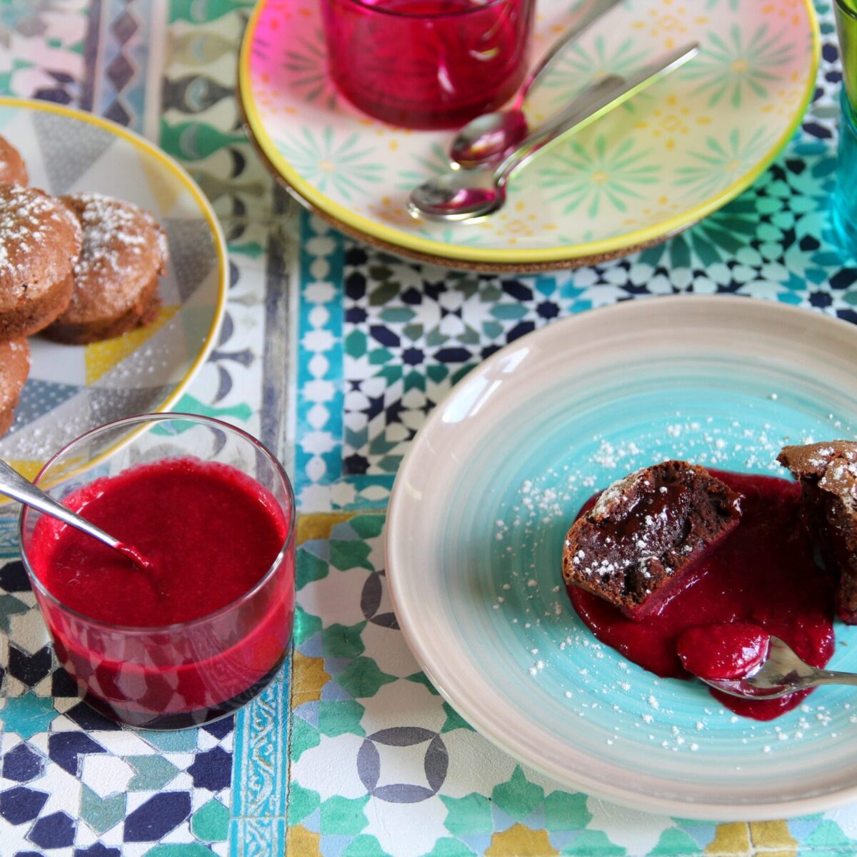 Coulant au chocolat noir, coulis cerise