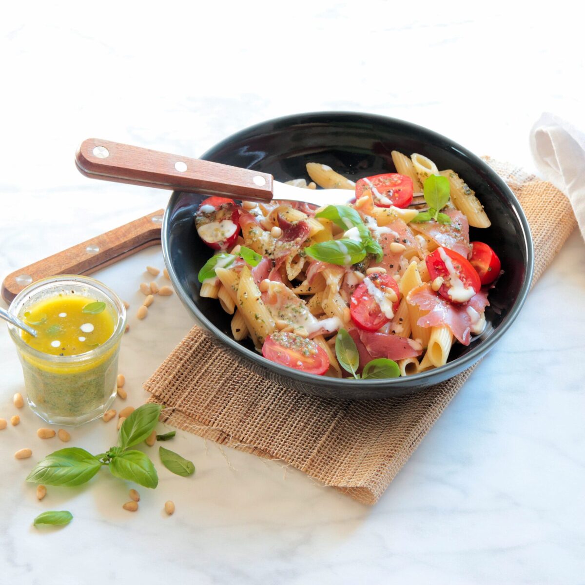 Salade de pennes, jambon cru, tomates cerises et sauce crémeuse au pesto