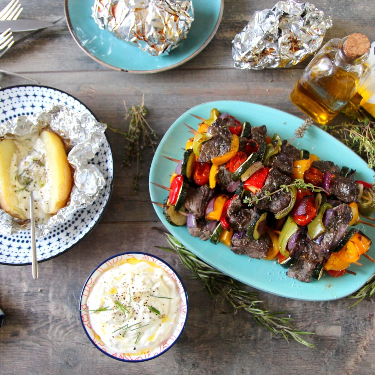Brochettes bœuf, légumes et poivrons grillés au barbecue, accompagnées de leur pomme de terre en papillote