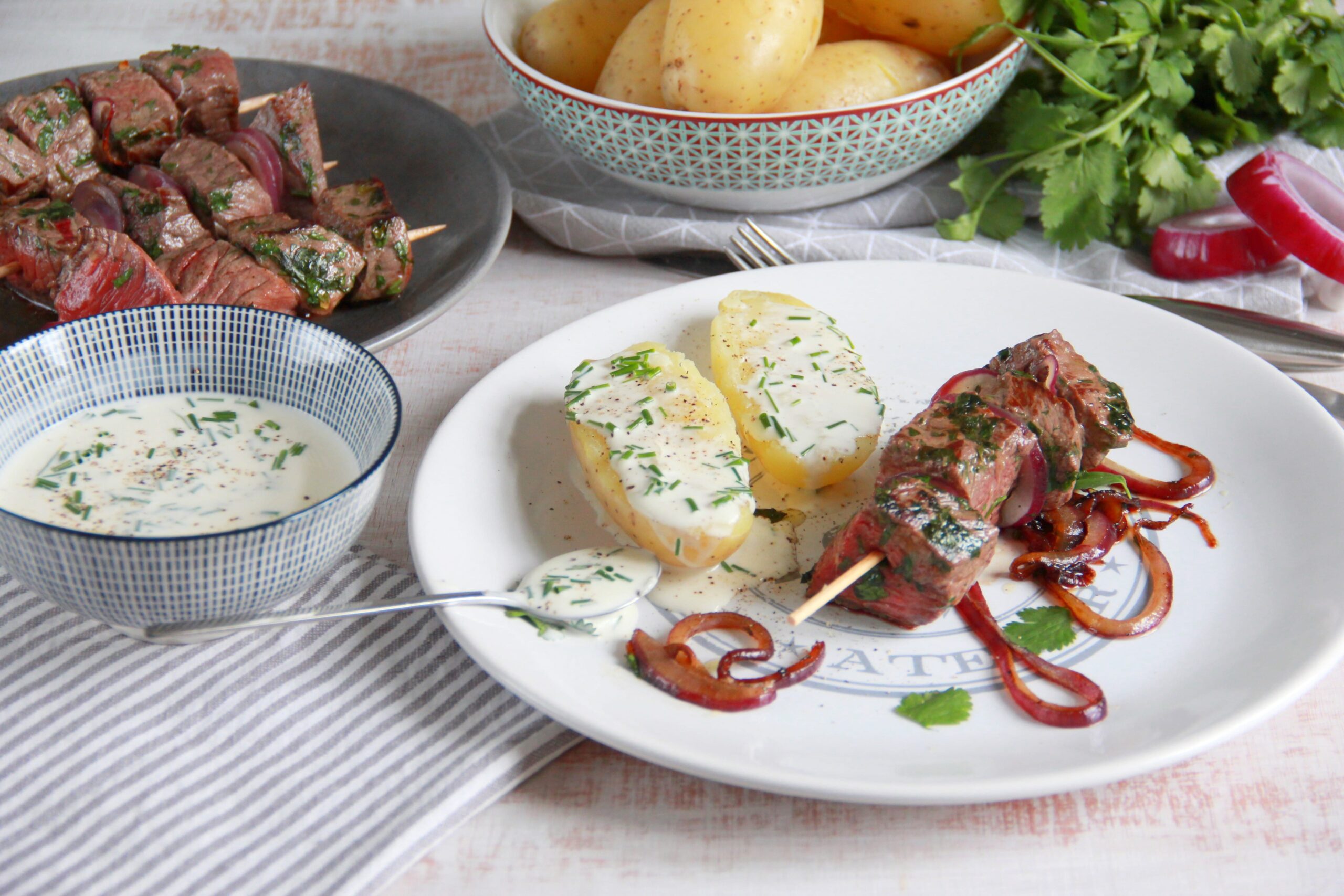 7. Dans chaque assiette, je dépose une brochette, j’entoure avec le mélange oignons-coriandre. Je coupe les pommes de terre en 2, et verse dessus le mélange crème/fromage frais/ ciboulette et je sers tout de suite