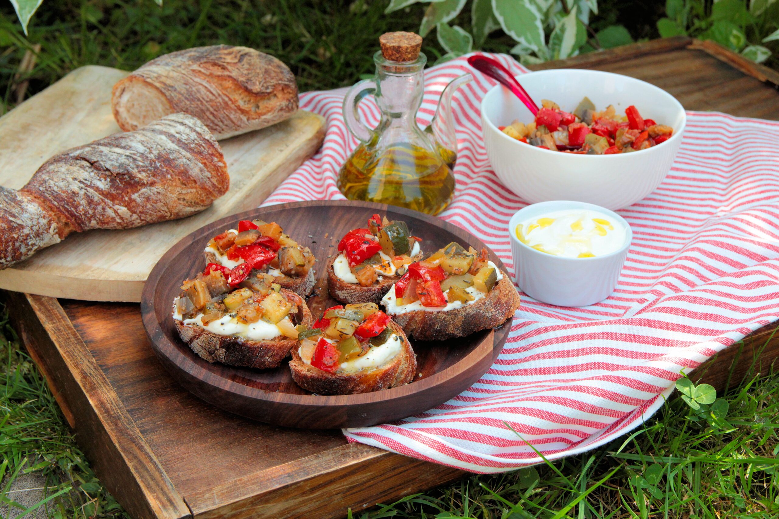- Au moment de servir je dépose une cuillère à café de crème sur chaque rondelle de pain grillé, j’ajoute un peu de ratatouille et je déguste !