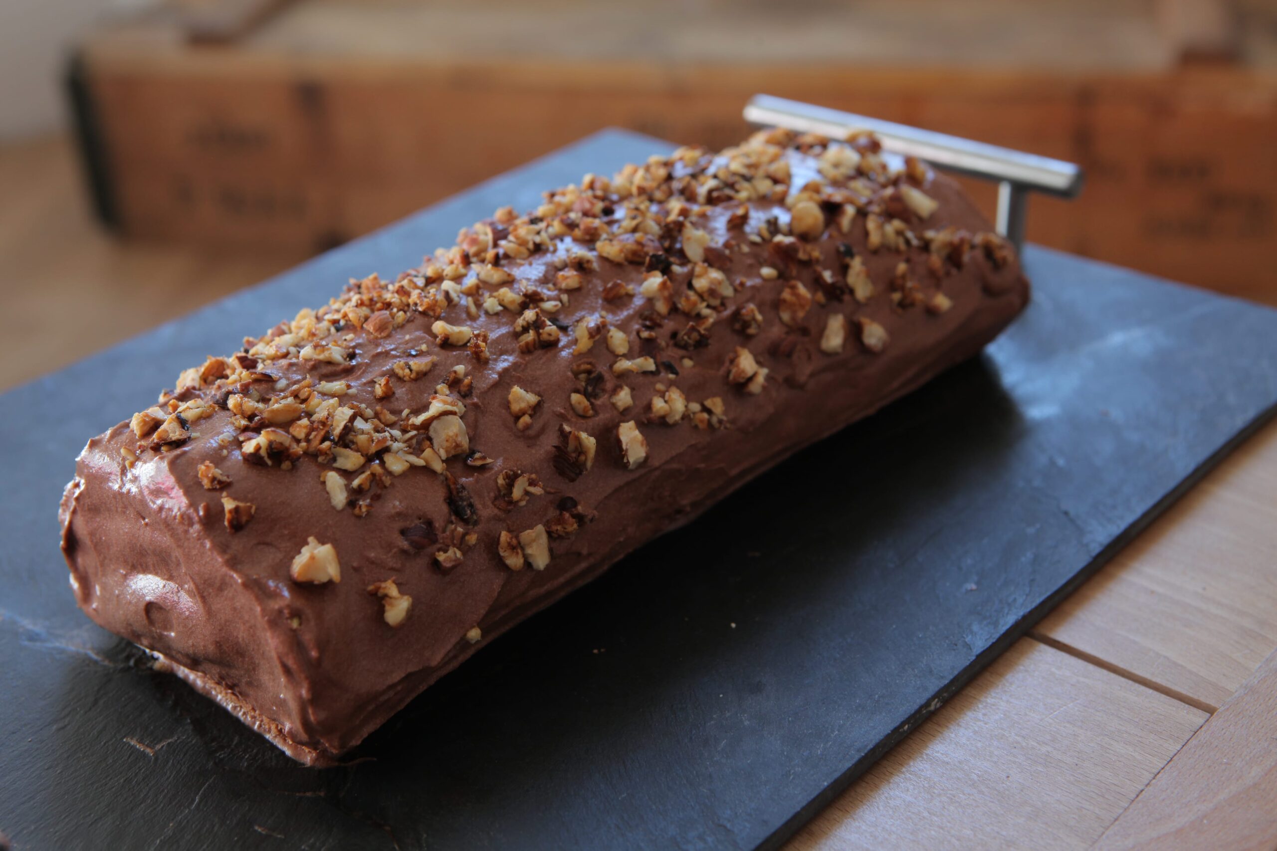 - Je roule délicatement la bûche en escargot en prenant soin de ne pas la casser. Je la recouvre du reste de crème au chocolat et la décore avec le reste des noisettes caramélisées.