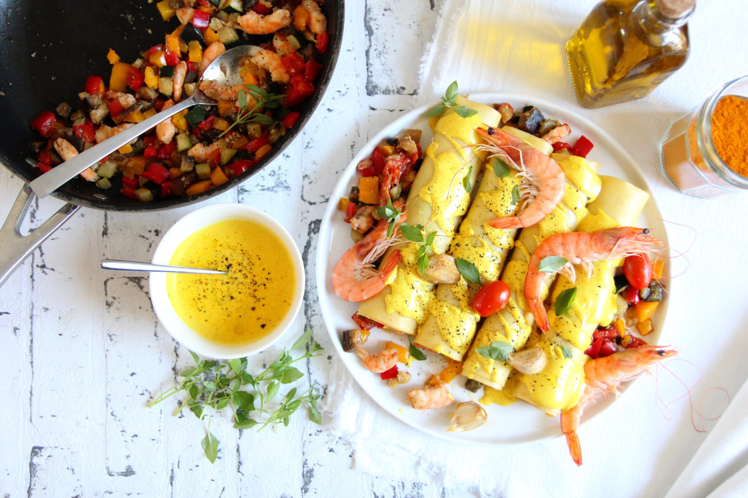 6. J’ajoute la crevette et l’ail en chemise pour décorer vos assiettes. Je verse la crème au curry et curcuma sur le cannelloni.