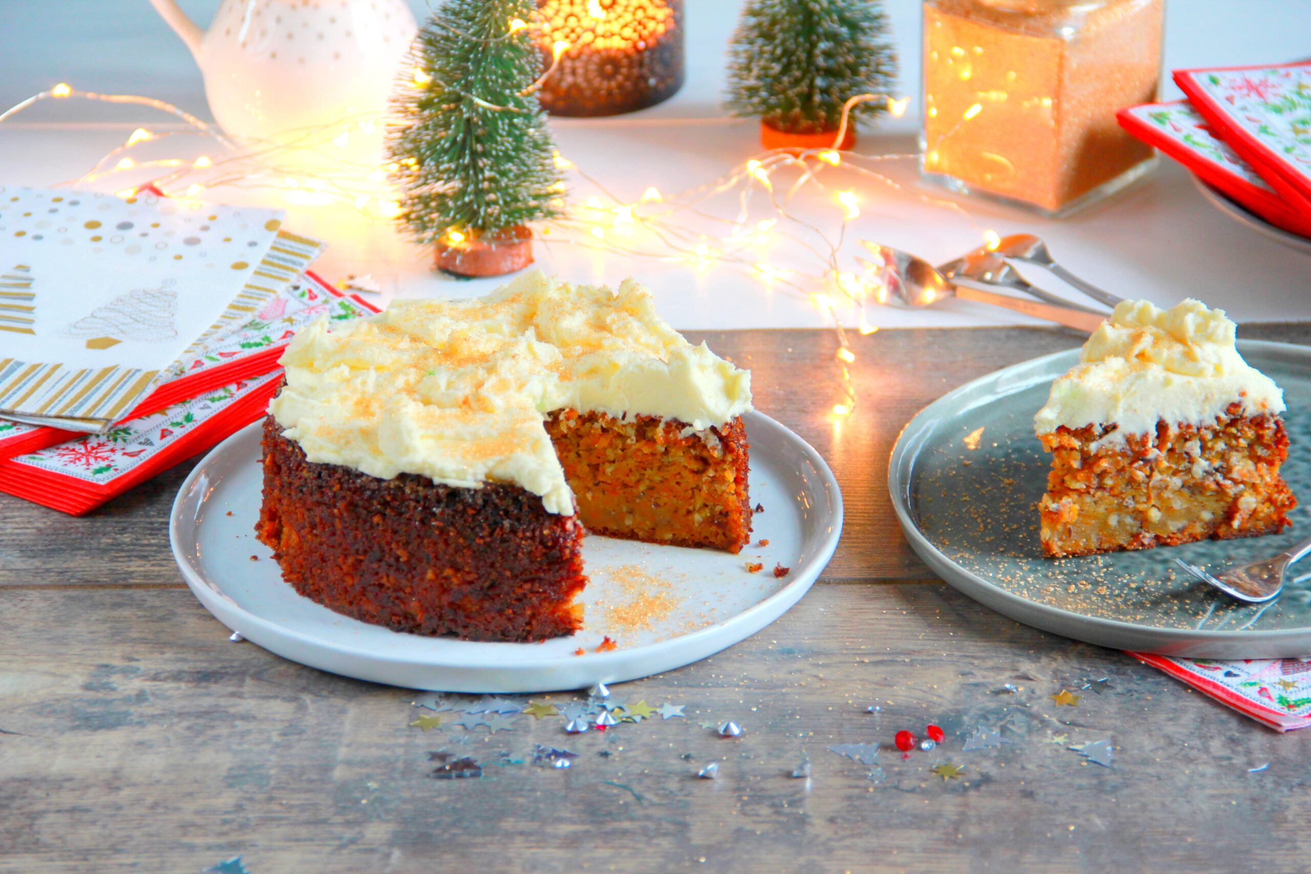 Je parsème mon carrot-cake de sucre pailleté pour rappeler mes décors de Noël !