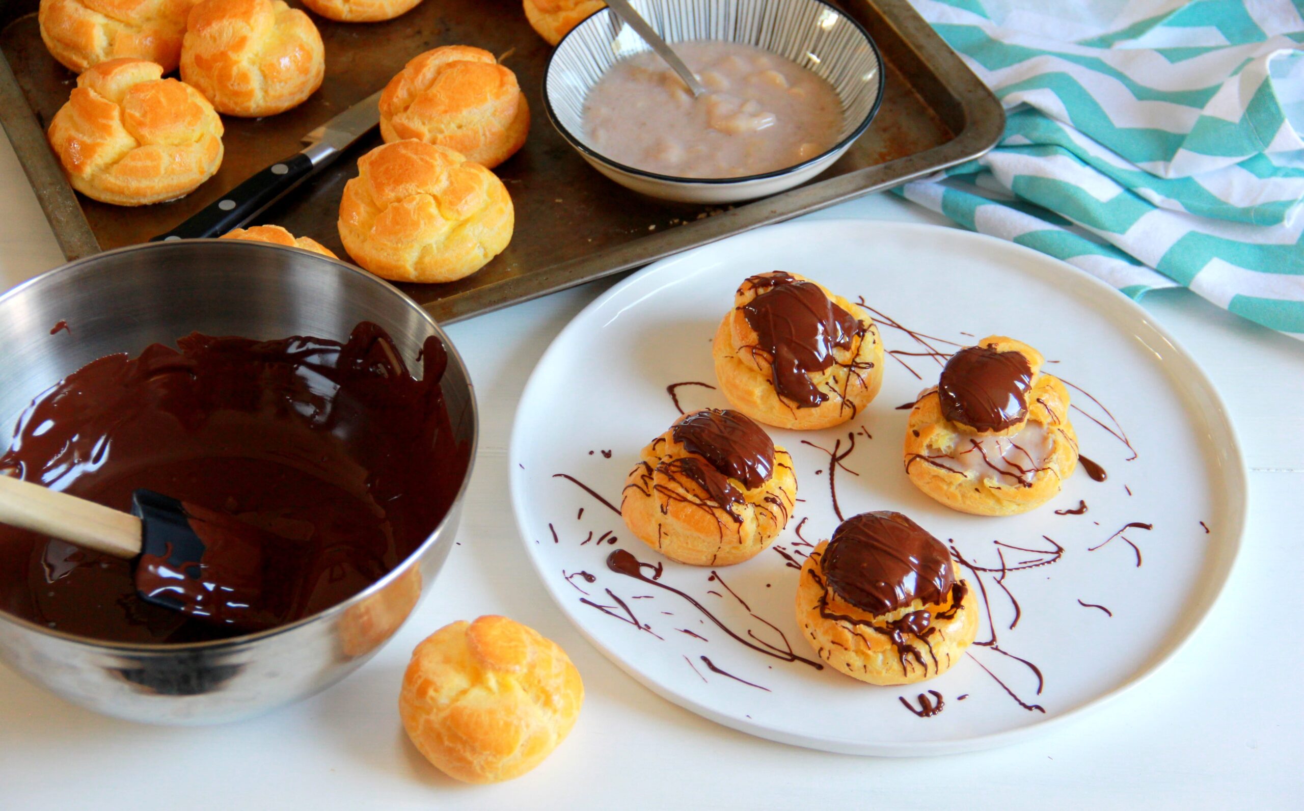 Tiède, ouvrez-les légèrement puis insérez de la banane travaillée avec la crème, puis versez le chocolat fondu sur tous les choux.