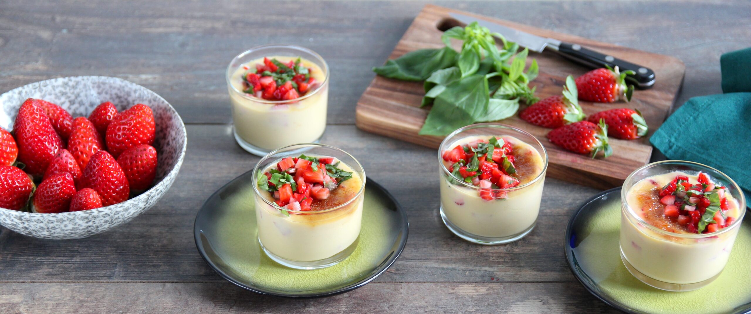 6. Pour le dressage, je remplis les coupes avec la crème, je saupoudre de cassonade et je brûle le dessus au chalumeau.