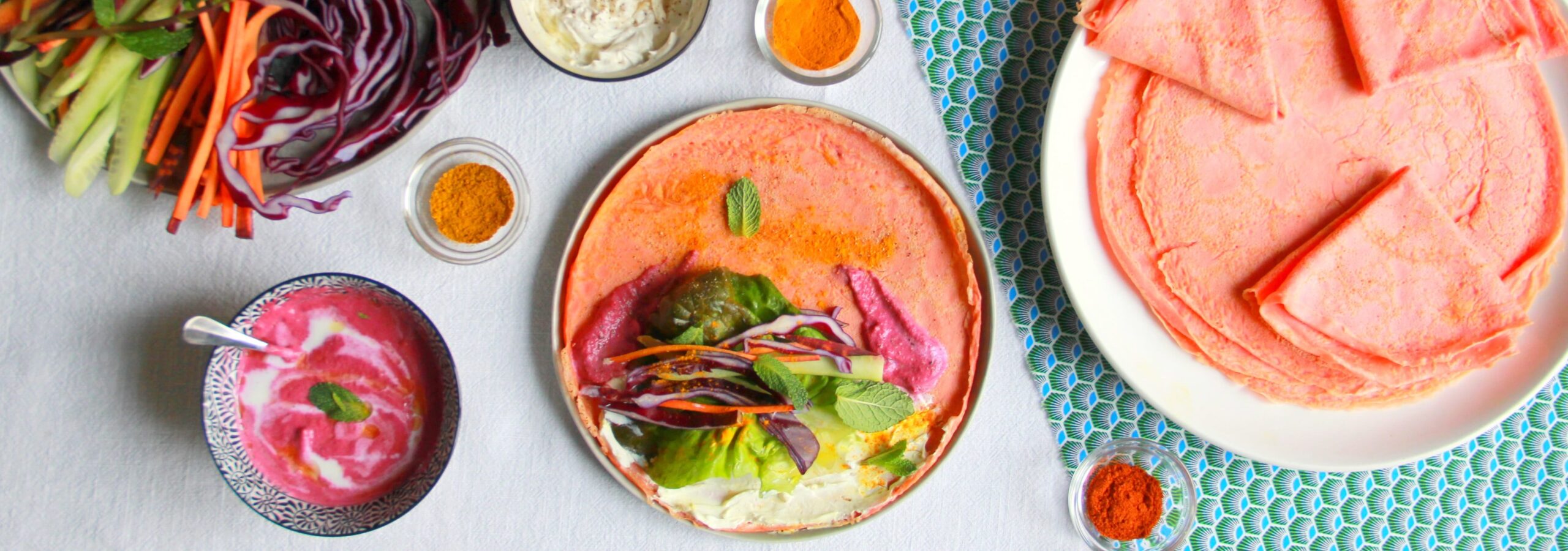 Enfin, je garnis les crêpes roses à la betterave avec du fromage frais, des crudités, de la menthe fraîche, de la sauce crémeuse à la betterave, et j’ajoute une pincée d’épices.
