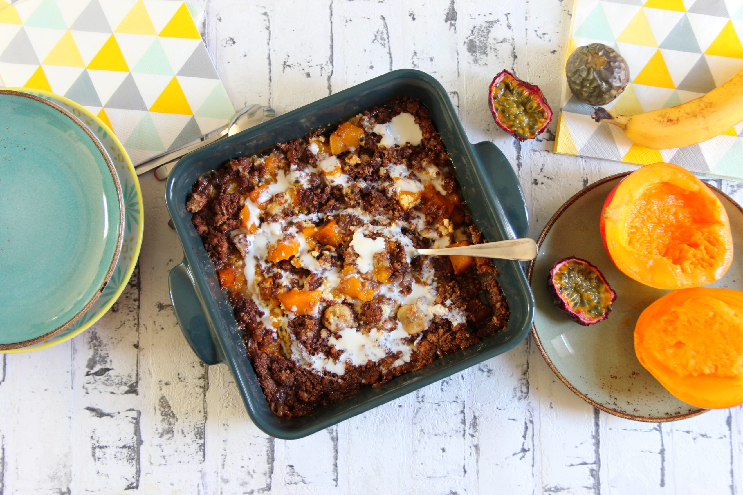 - Je coupe ensuite les bananes en rondelles et je les dispose en rosace dans le plat, sur la crème aux fruits de la passion. Enfin, je recouvre le tout de la pâte à crumble.
