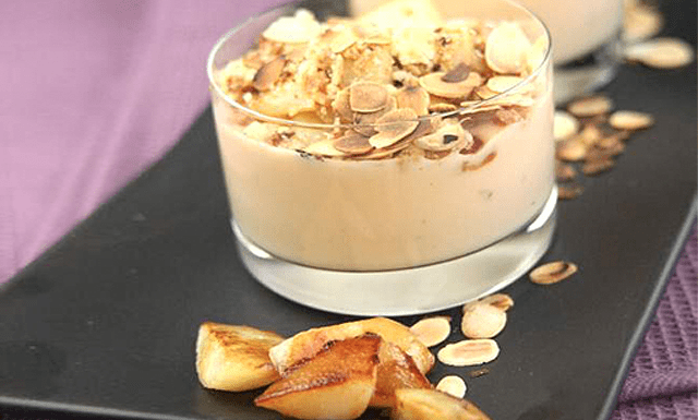 4. Ensuite, je répartis la Crème Anglaise au fond des verres, puis j’ajoute les poires rôties, et enfin, je parsème de pâte à crumble.