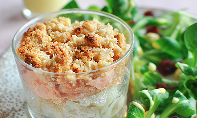 8. Ensuite, j’enfourne pour 20 minutes, jusqu’à ce que le crumble soit bien doré. Dans un bol, je fouette la moutarde avec la crème.
