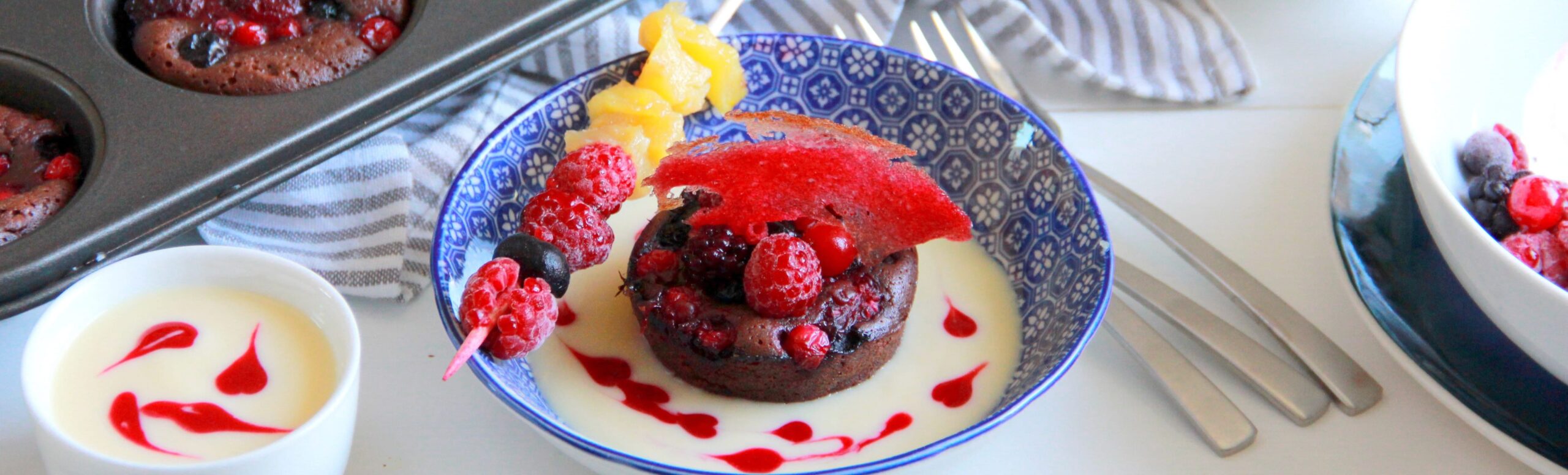 9. Pendant la cuisson des fondants, je prépare des mini-brochettes avec l’ananas caramélisé et les fruits rouges.