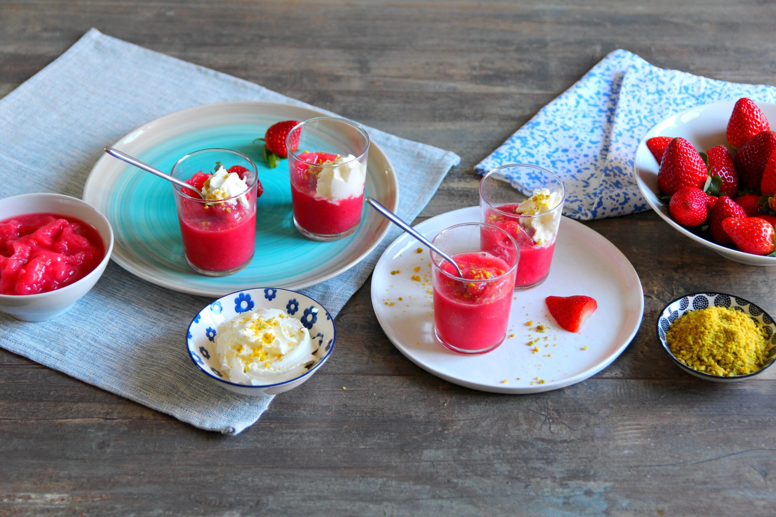 - Je répartis le granité à la fraise dans des verrines, puis j’ajoute de la crème légère fouettée par-dessus, en saupoudrant de pistaches concassées.