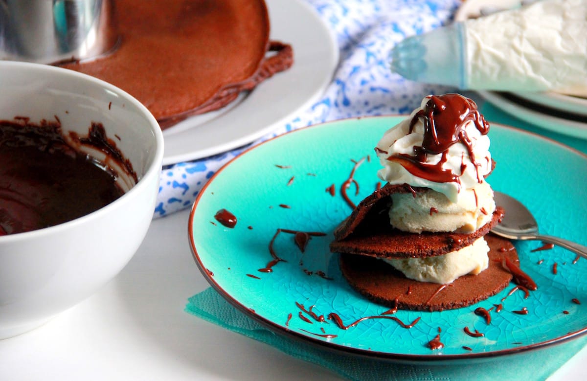 - Je monte les crêpes comme un mille-feuilles et j’y dépose une boule de glace. Je décore de crème Chantilly et j’ajoute de la sauce au chocolat.
