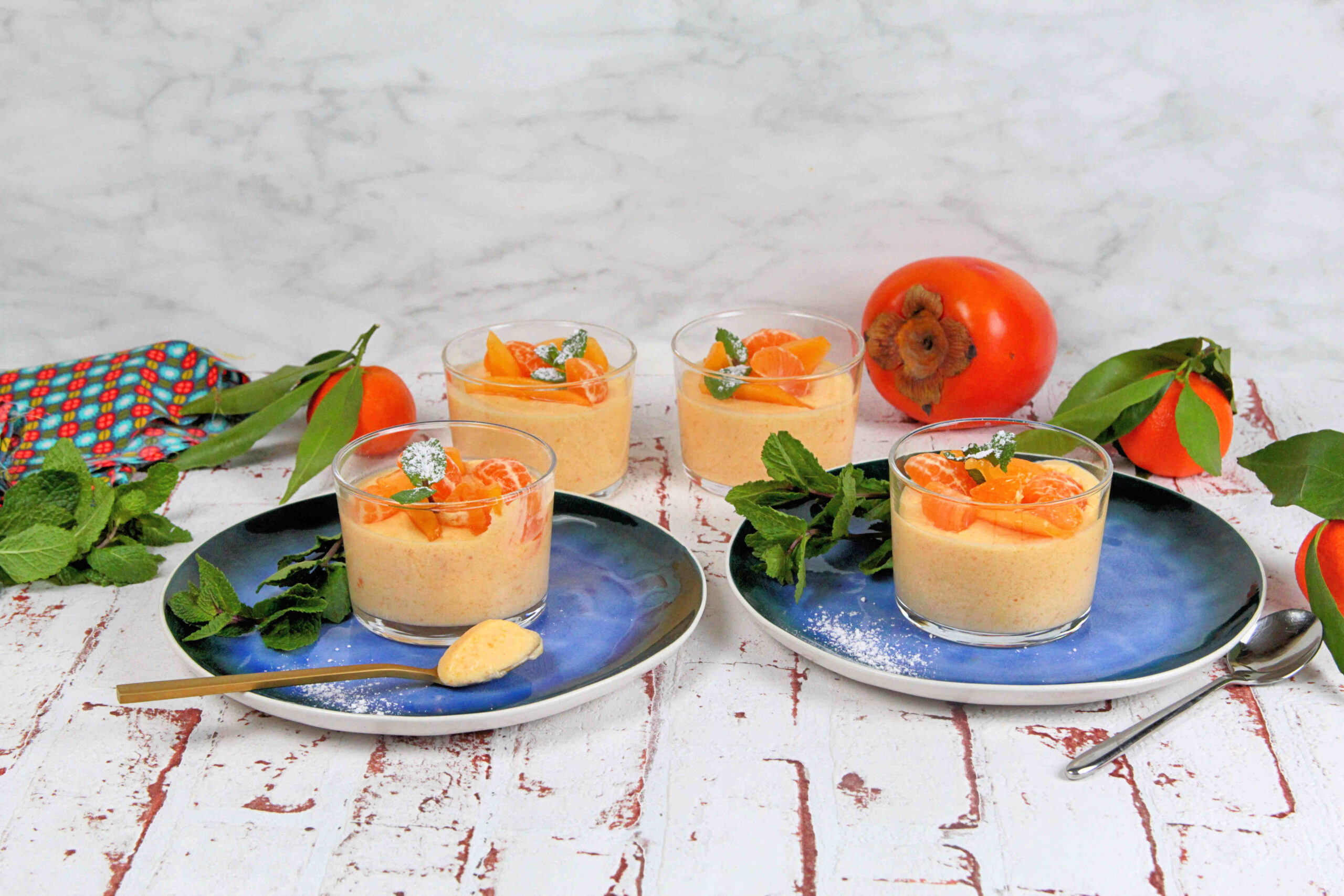 8. Au moment de servir, j’ajoute sur le dessus de chaque verrine quelques quartiers de kaki et de clémentine.