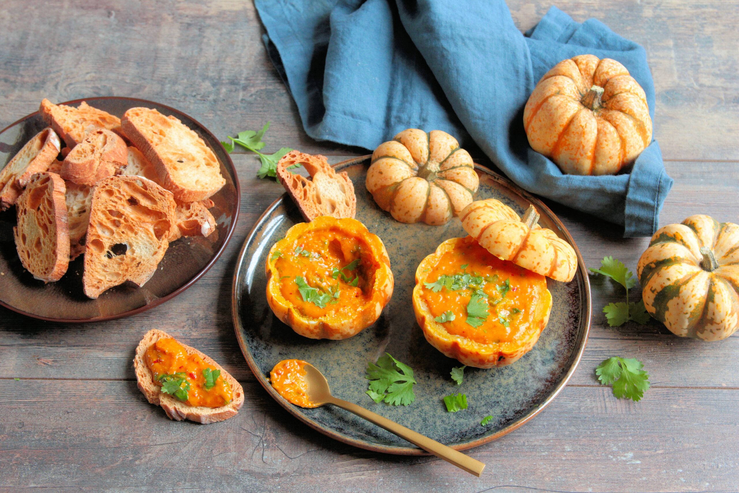 8. Je verse la préparation dans les patidous et je les accompagne de petites tartines de pain grillé.