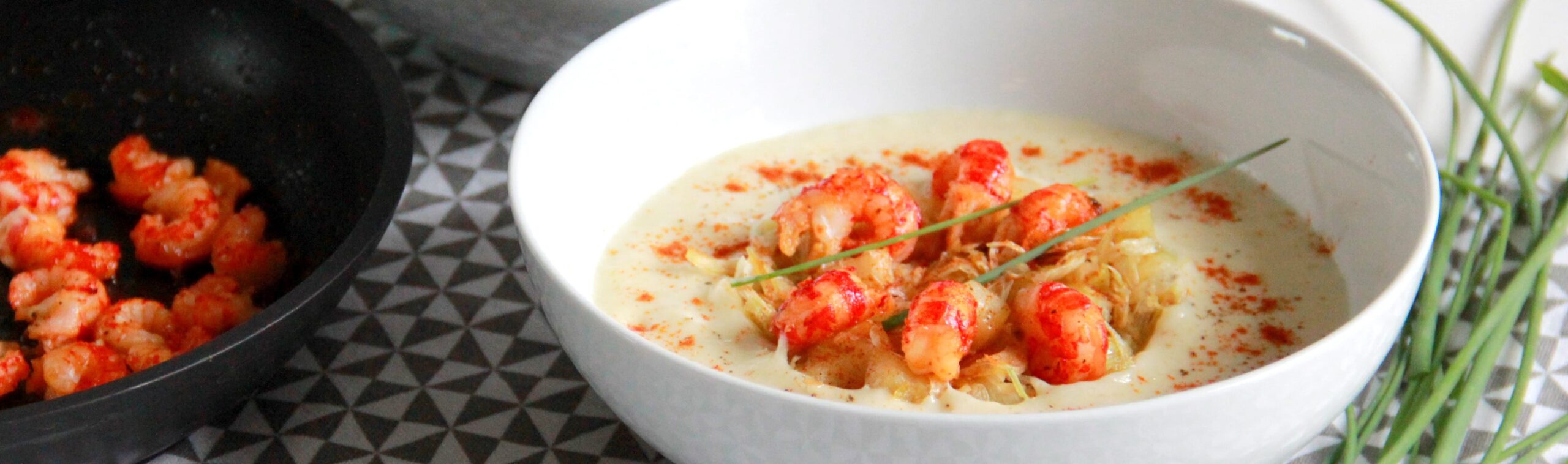 - Je verse le velouté autour du cercle de légumes puis j’ajoute les écrevisses poêlées.