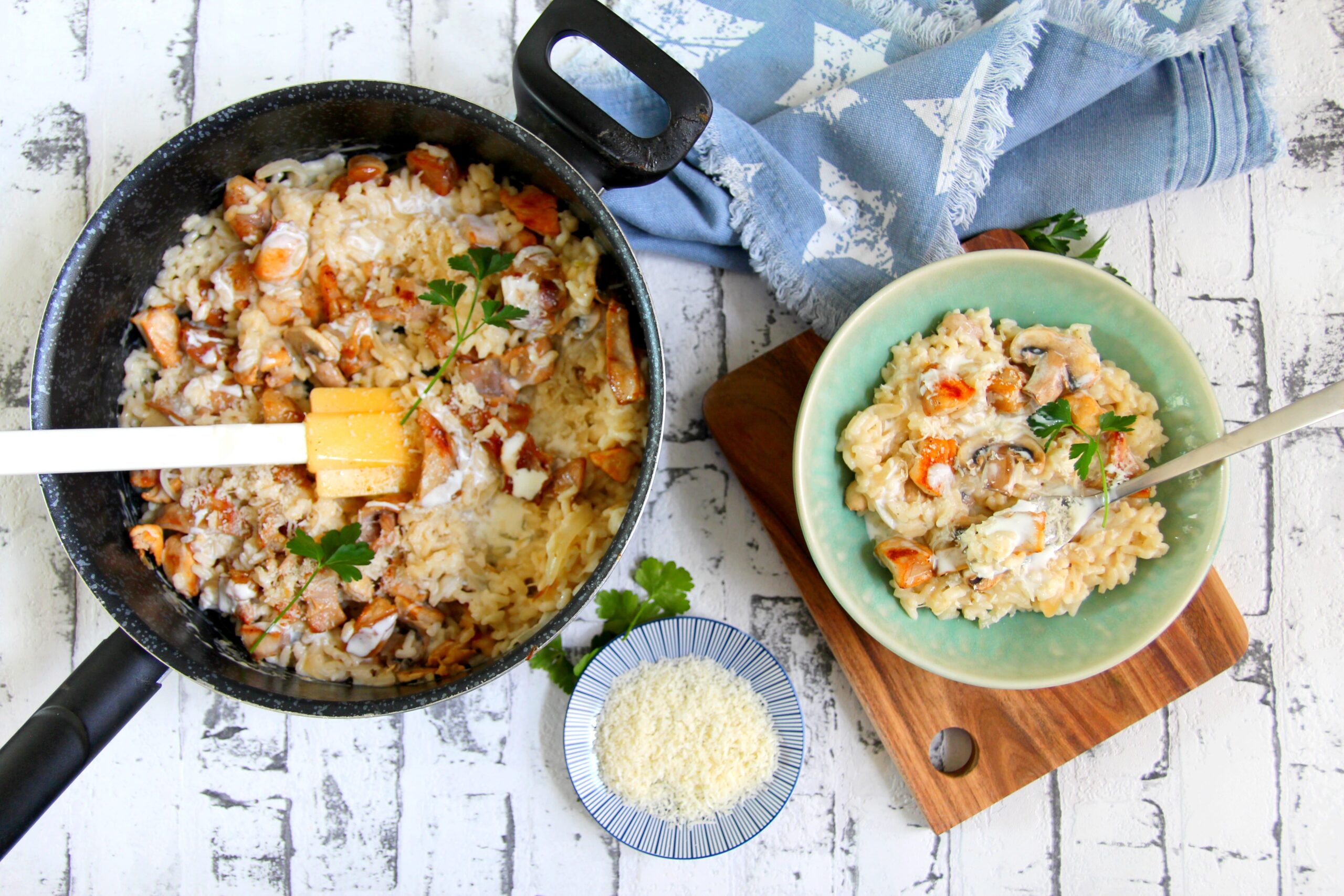 - J’ajoute les champignons et le lapin dans le risotto à mi-cuisson. En fin de cuisson, je goûte et je sale et je poivre à nouveau le risotto si nécessaire.