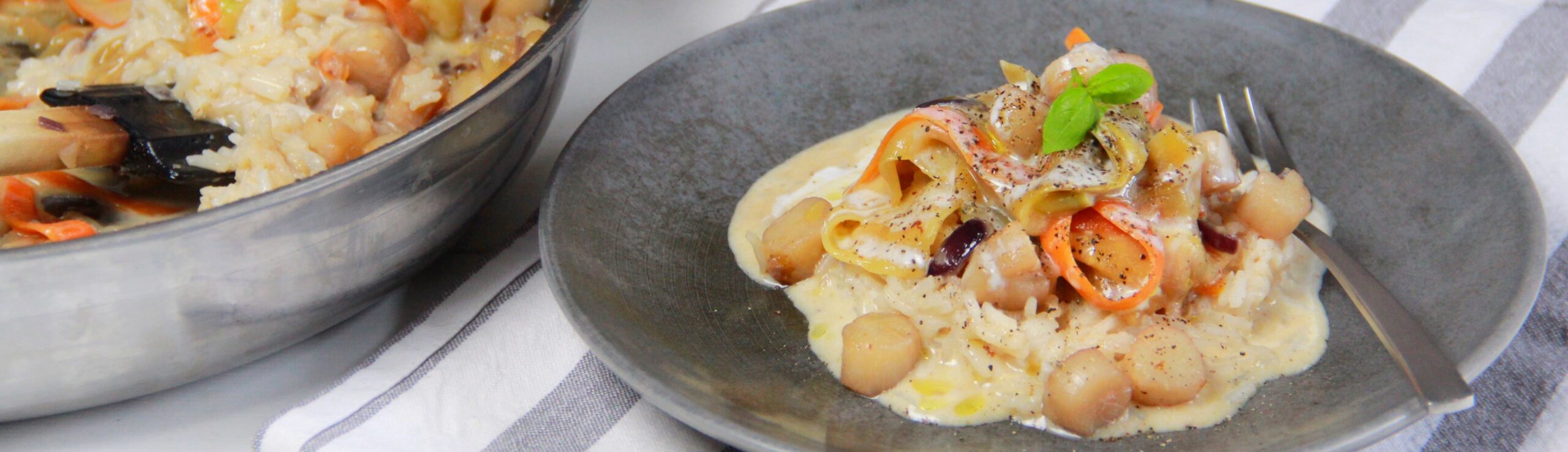 - Je fais revenir l’oignon dans l’huile d’olive. Quand il est doré, je rajoute les Saint-Jacques et je les fais dorer.