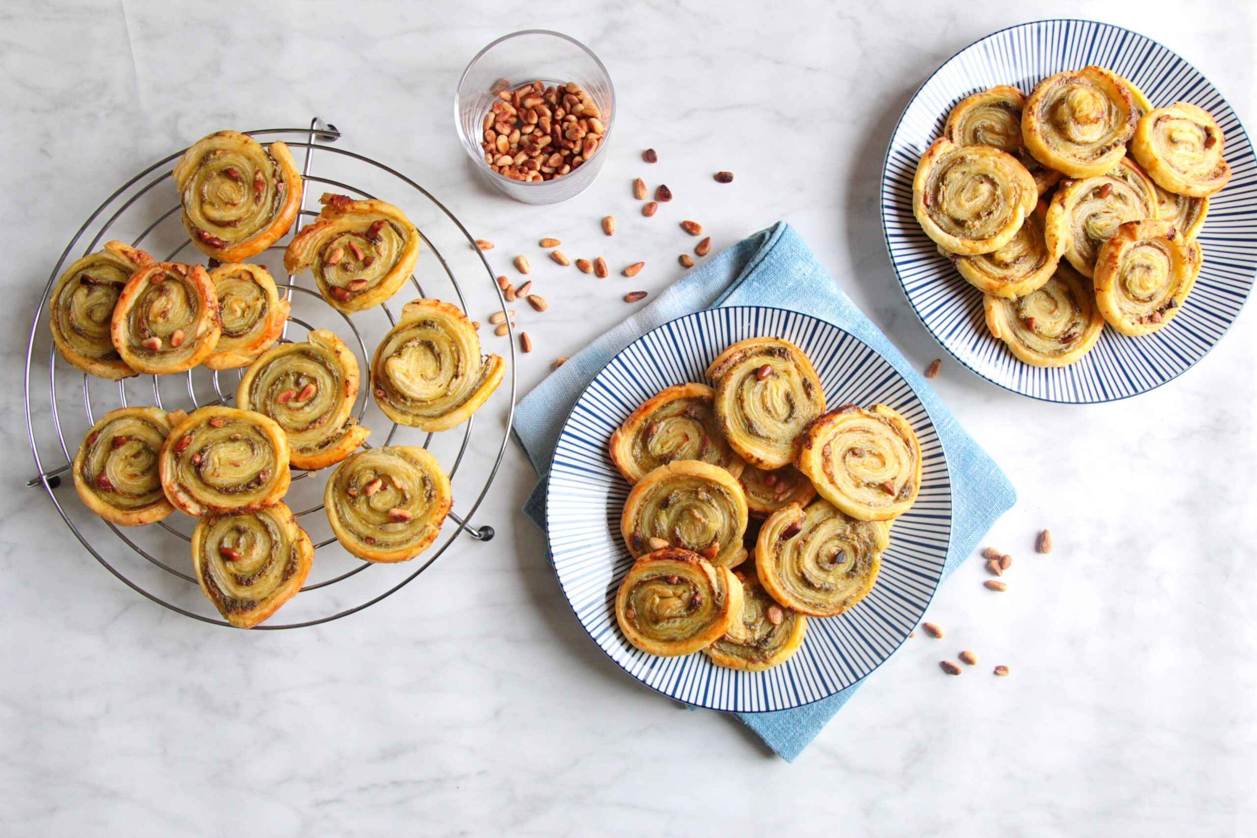 - J’étale la crème, puis le pesto sur l’une des pâtes feuilletées, je poivre.