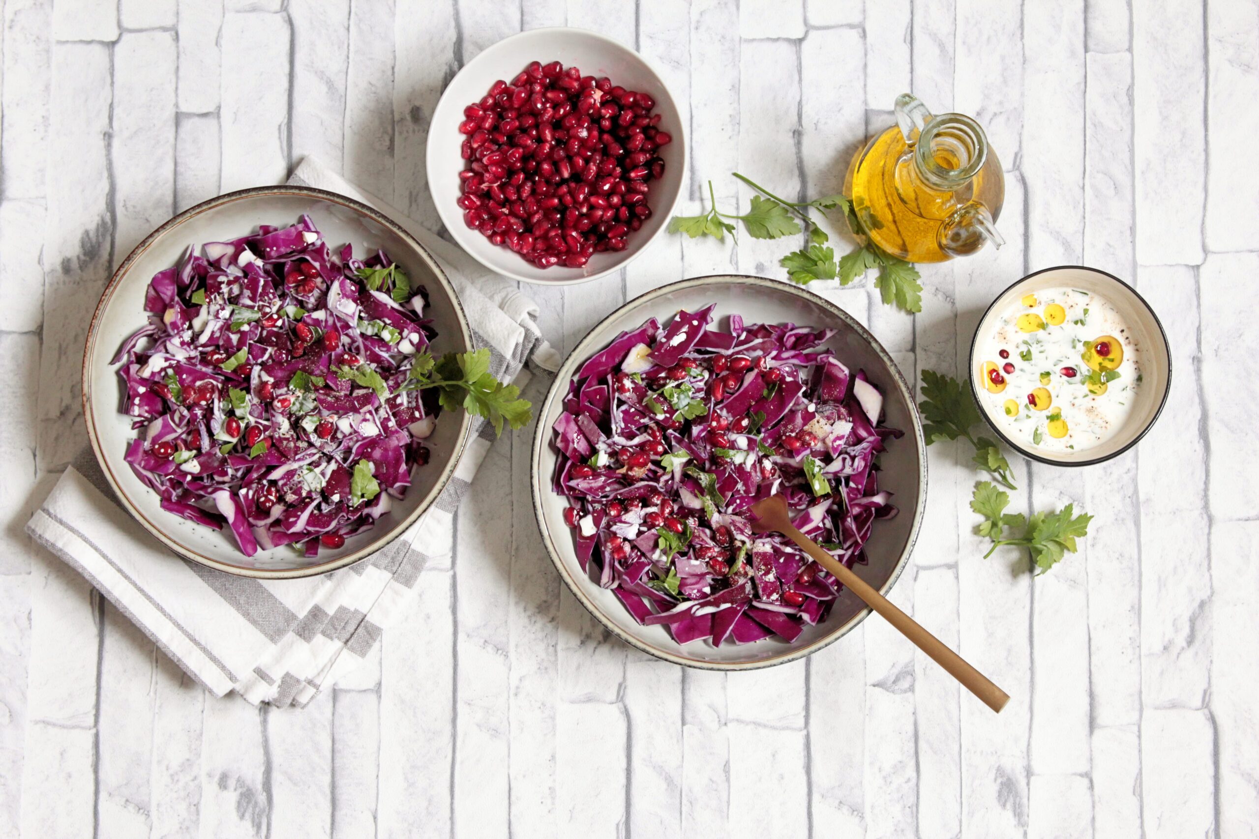 - Je répartis l’émincé de chou rouge dans des assiettes creuses et j’ajoute quelques graines de grenade.