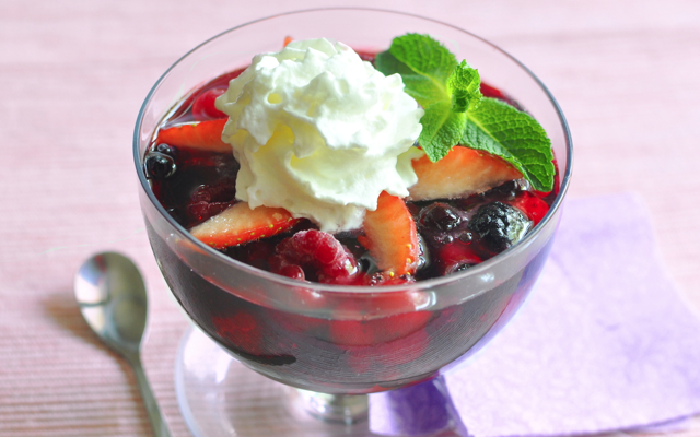 - Passé ce temps, je répartis la soupe de fruits dans des grands verres. Sur chacun, je dépose une pression de crème fouettée.