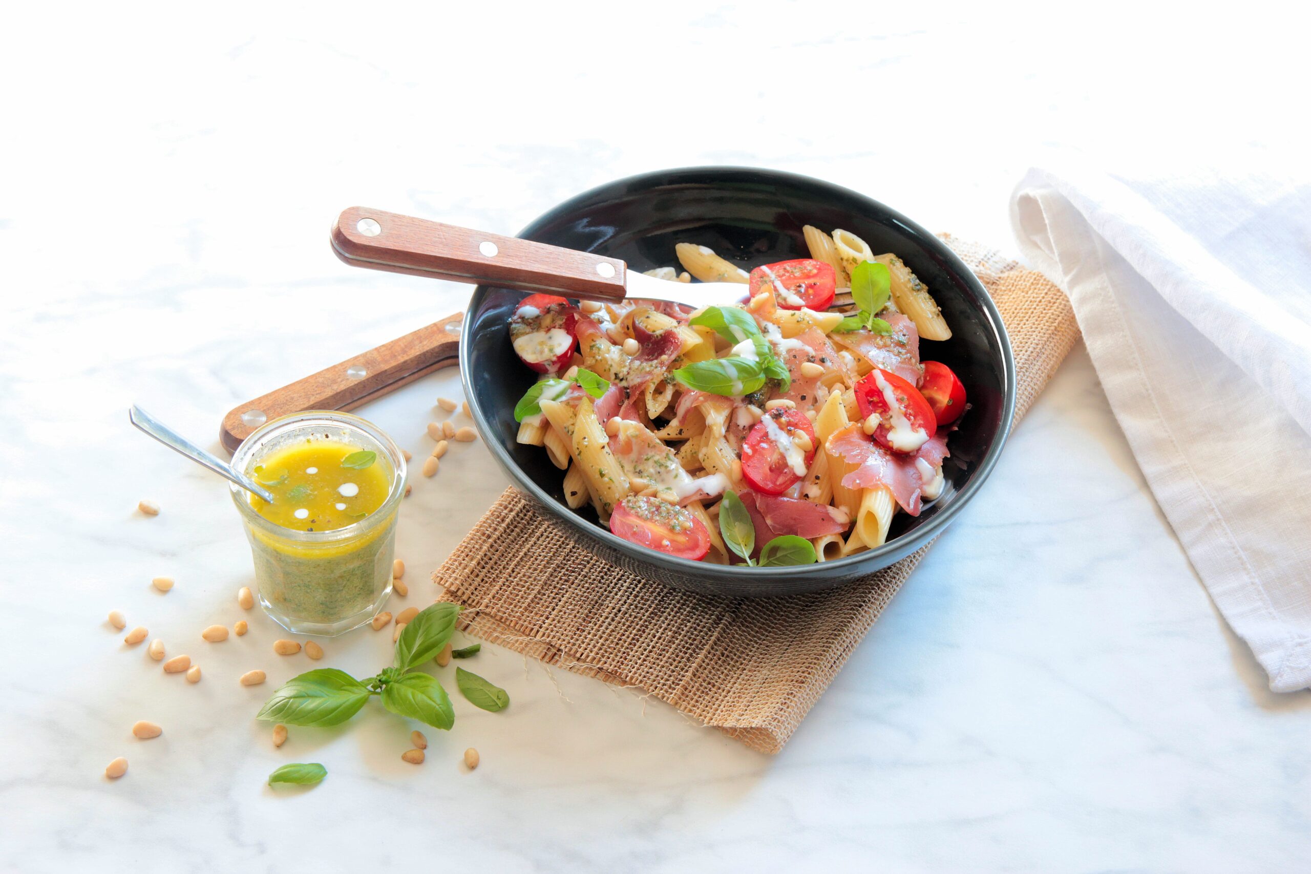 Salade de pennes, jambon cru, tomates cerises et sauce crémeuse au pesto