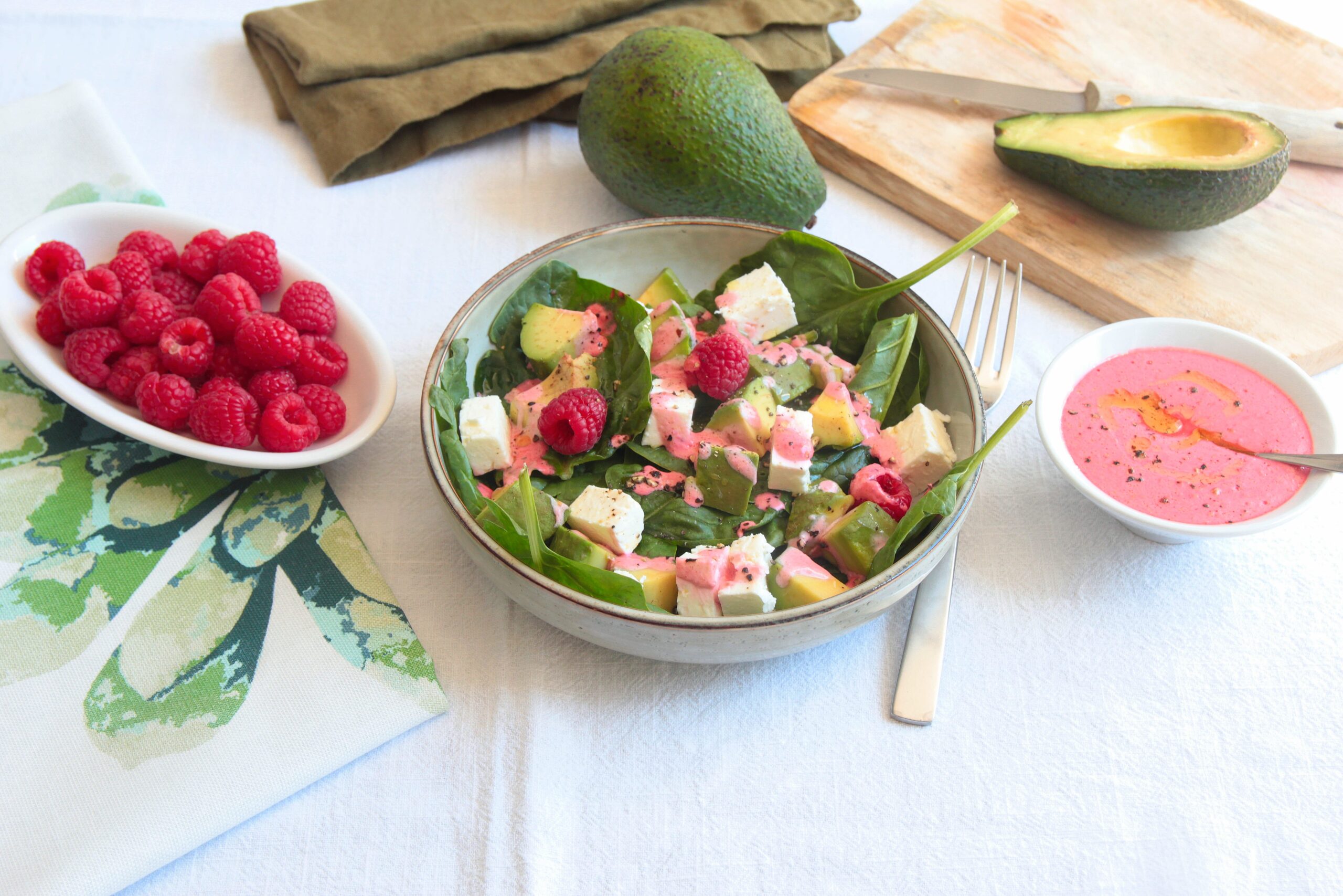 Salade de pousses d’épinards, avocat, feta et crème de framboises