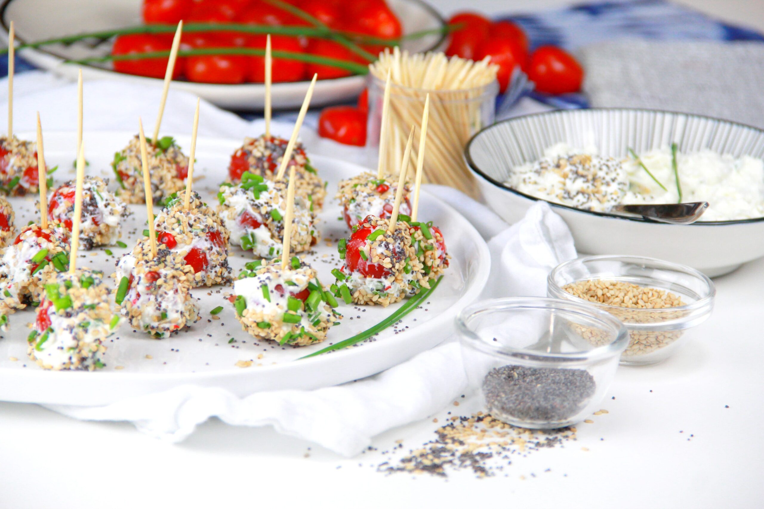 3. Je lave et sèche les tomates cerises, puis je façonne des boulettes en enrobant chaque tomate cerise dans le mélange de fromage frais.